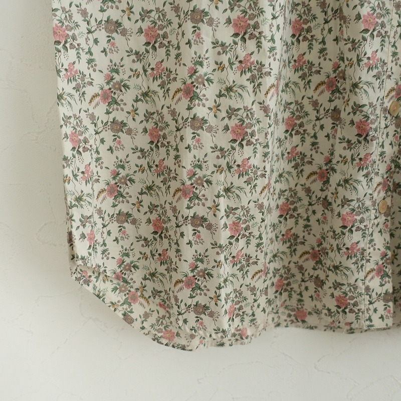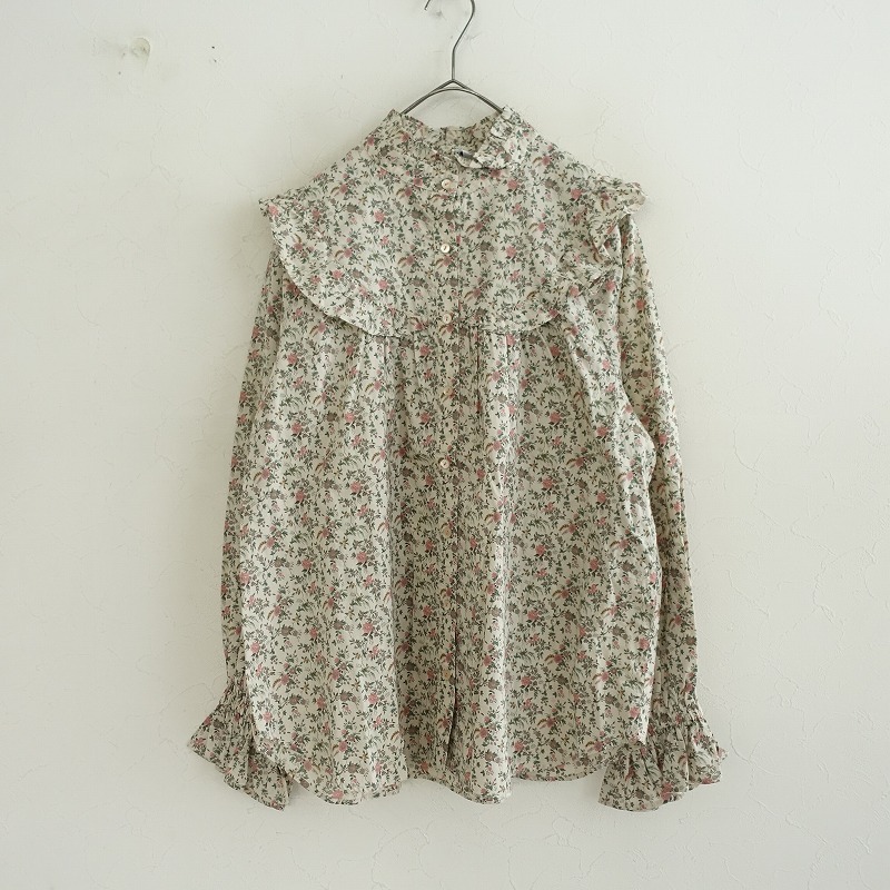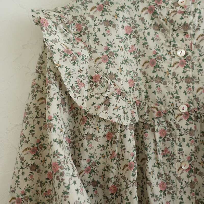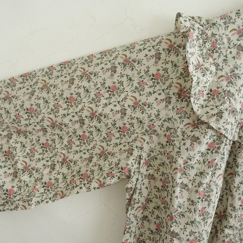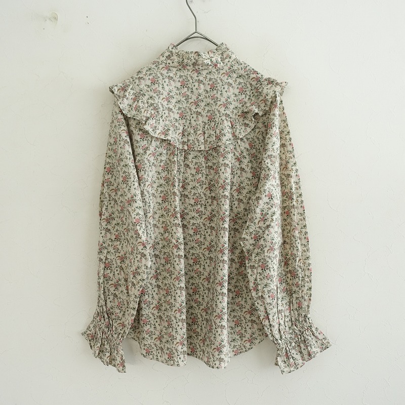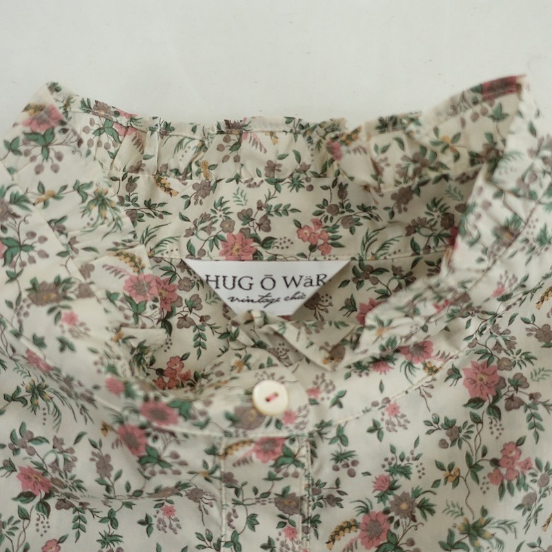 | Hug O WarのフロリバンダLIBERTYプリントフリルブラウスです。カラーはオフホワイト×ピンクなどの配色使いです。LIBERTYプリント「フロリバンダ」のコットンタナローン生地を使用。薄手の滑らかな生地で、少し透け感がございます。衿・前後ラウンドヨーク部分・袖口にフリルを配したブラウスです。ヨークの下にはギャザーを配し、袖口はスライドアップが可能のゴム入りであしらわれております。ポケットはございません。 |