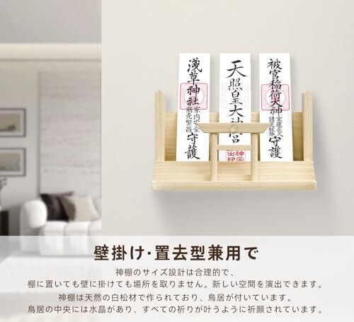 【商品詳細】神棚 壁掛け モダンデザイン 天然木材 おしゃれ お札立て 雲板付き 穴あけ不要 賃貸住宅に最適 御札立て 水晶飾り 鳥居付き 破魔矢置き ホルダー size:26.5x14x9.5cm