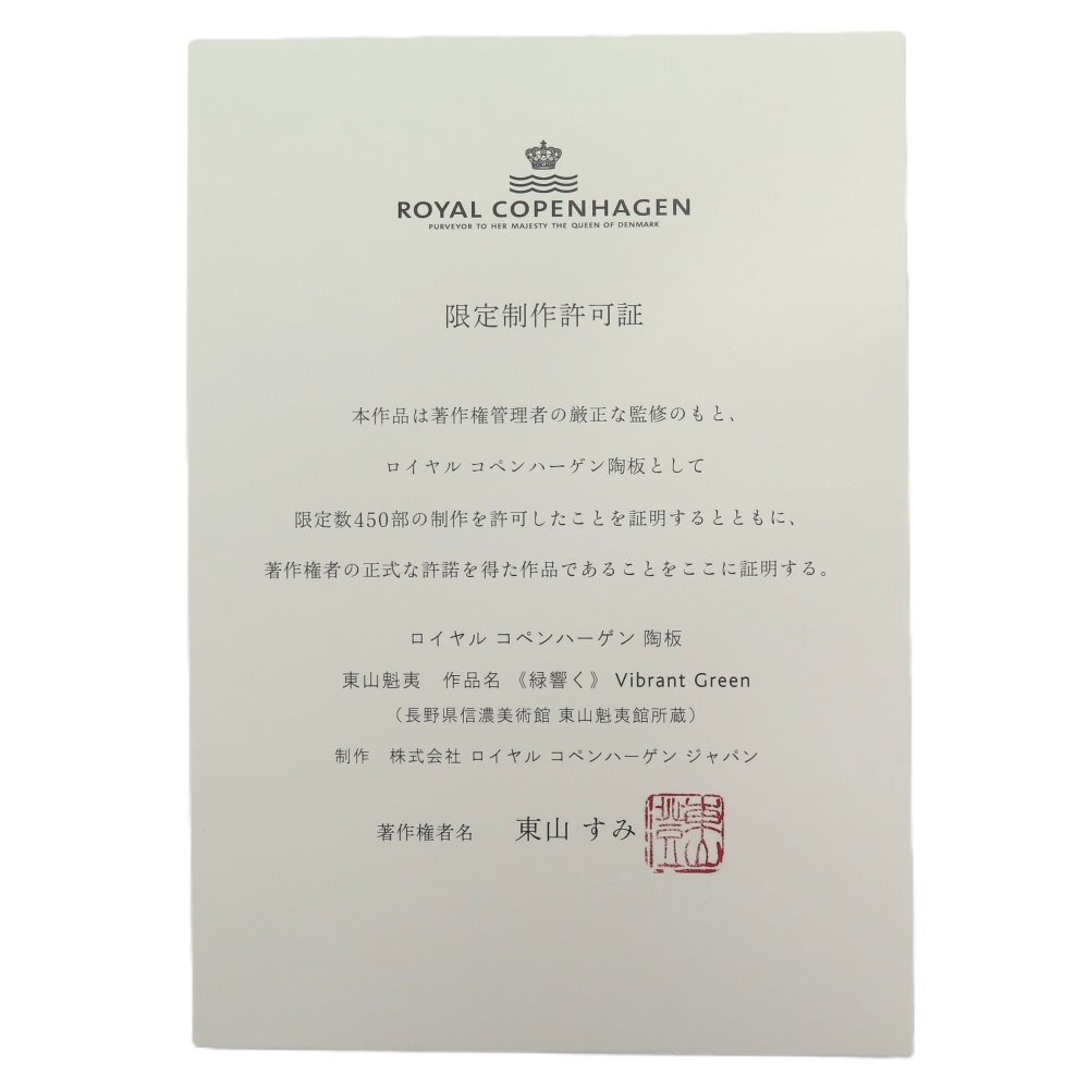 | 商品名 | 1円~ Royal Copenhagen ロイヤルコペンハーゲン 東山魁夷「緑響く」プラーク 陶板画 額装 箱・許可証付 ※同梱不可 4222762 |
