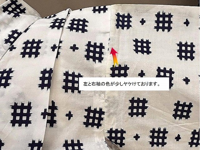 | K6103-04 河句野 日本製のお仕立上りの子ども用ゆかた・浴衣(単品)です。 夏祭りに★ 花火大会に★とこちらのかわいいゆかたで おでかけしてみませんか♪ ひも付きなので簡単に着用できます。 難あり・訳ありとはたたんである部分・肩山・袖山などに少し変色(ヤケ)が見られます。(写真添付)◎ ご理解の上でお買い求めくださるようお願いいたします。 お色・柄は、白地に紺色にて井桁の柄や十字の柄があります。 難ありは身頃と袖との色(ヤケ)の相違が見られます。 | ||||||||