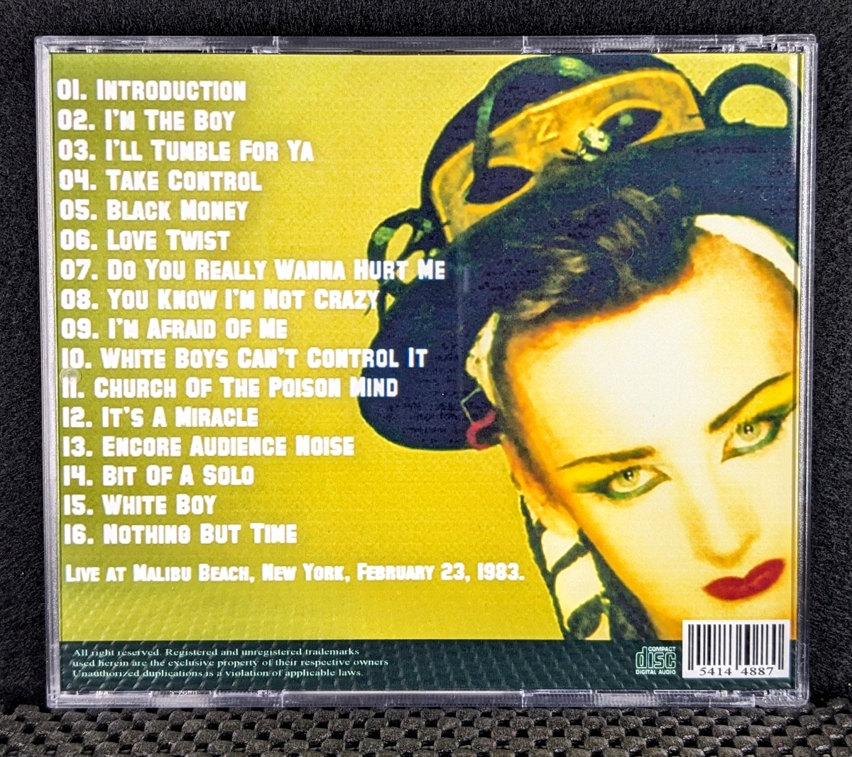 01. Introduction / 02. I'm The Boy / 03. I'll Tumble For Ya / 04. Take Control / 05. Black Money / 06. Love Twist / 07. Do You Really Wanna Hurt Me / 08. You Know I'm Not Crazy / 09. I'm Afraid Of Me / 10. White Boys Can't Control It / 11. Church Of The Poison Mind / 12. It's A Miracle / 13. Encore AUD Noise / 14. Bit Of A Solo / 15. White Boy / 16. Nothing But Time