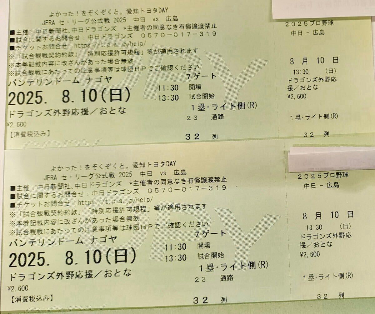 | 商品名稱 : | ☆2025年8月10日 中日 vs 広島 バンテリンドーム ドラゴンズ外野応援/おとな2枚 ライト側 (R) 32列 通路近く 昇竜 8/10(日) |