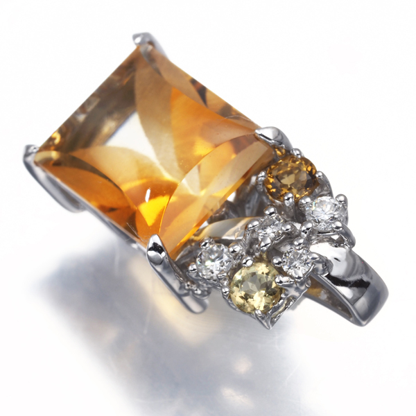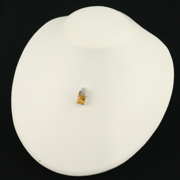 デザインカットが施されたシトリンをメインに、上部にダイヤモンドとイエローストーン(イエローベリルかと思われます)を飾ったペンダントトップ。胸元に華やかな印象を与えてくれますよ。 |