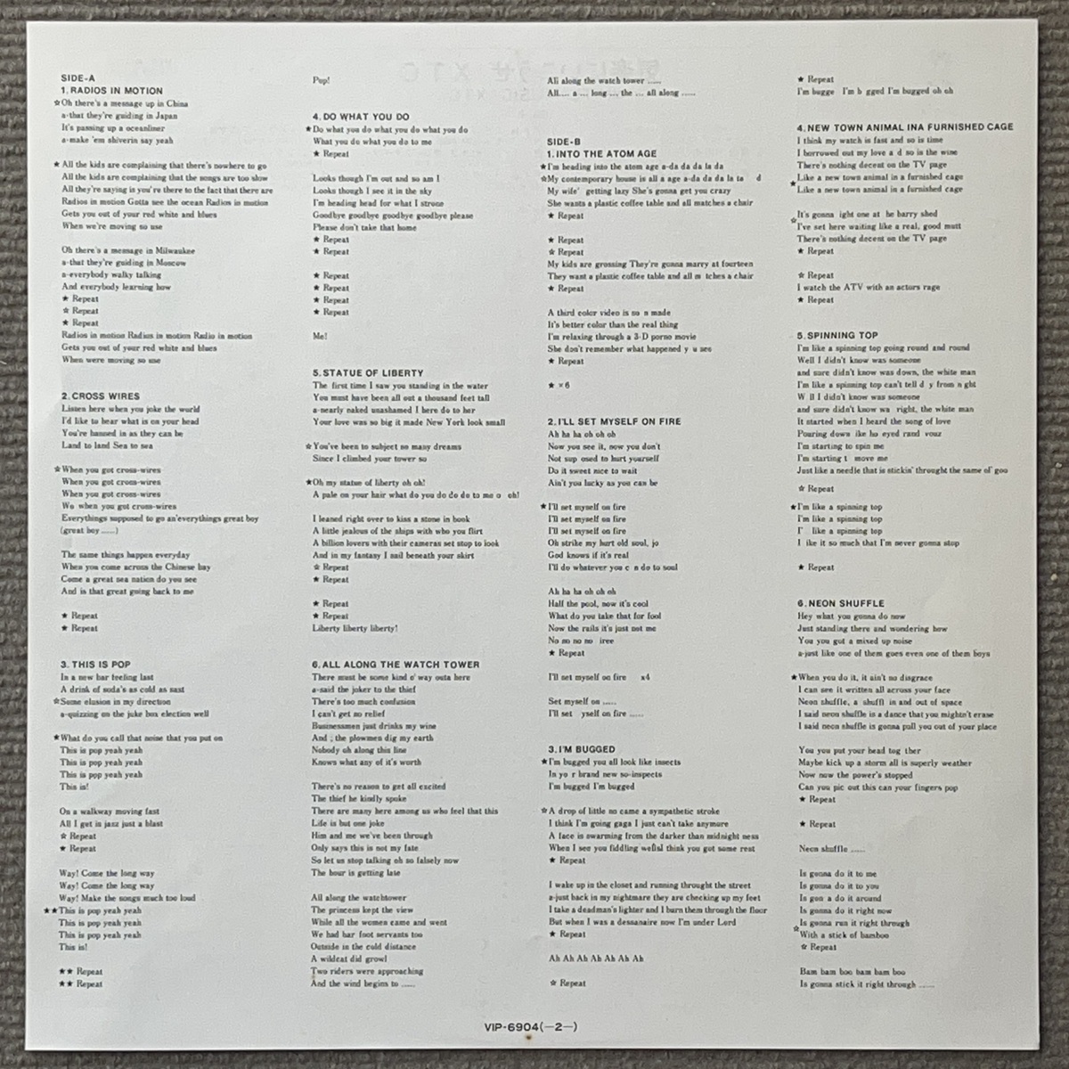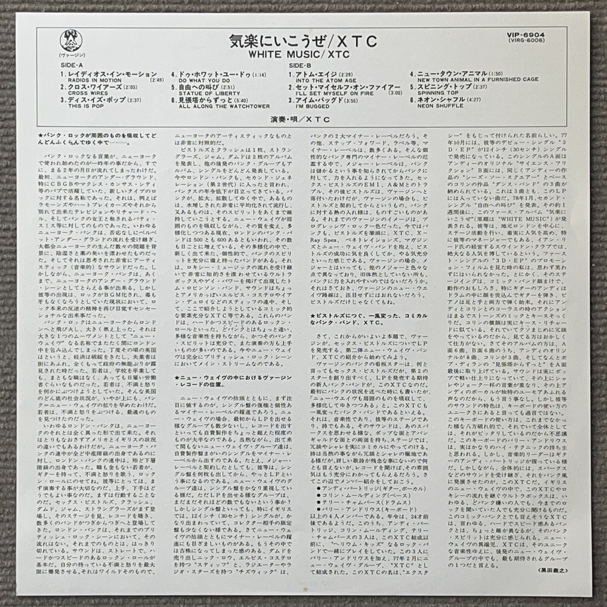 超音波クリーニング済みなのですぐにプレイできます。 内袋(半円ビニール)&外袋ビニール新品に交換済みです。 レコード発送専用ダンボールにて発送致します。 ニュー・ウェイヴの炎が燃え上がるロンドンで今、大旋風を巻き起こしているXTCの奇想天外なデビュー・アルバム!! 果してロック・エクスタシーとは……?(帯より) 【収録曲】 A1. Radios In Motion 2:52 A2. X Wires 2:03 A3. This Is Pop 2:38 A4. Do What You Do 1:14 A5. Statue Of Liberty 2:52 A6. All Along The Watchtower 5:40 B1. Atom Age 2:32 B2. Set Myself On Fire 3:00 B3. I'm Bugged 3:59 B4. New Town Animal 1:51 B5. Spinning Top 2:38 B6. Neon Shuffle 4:25 |