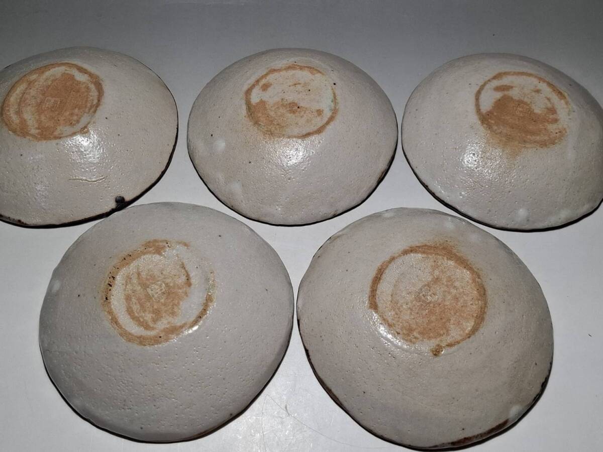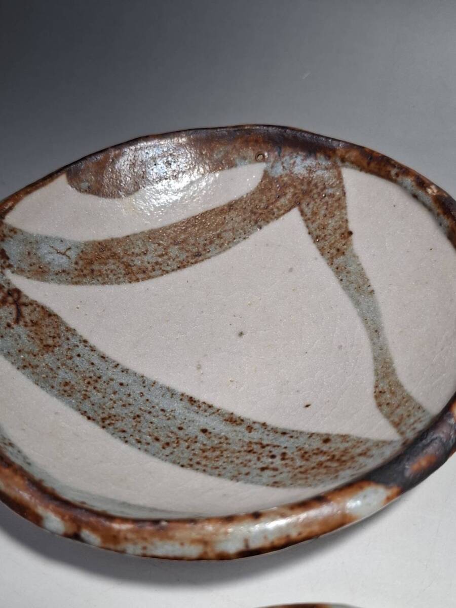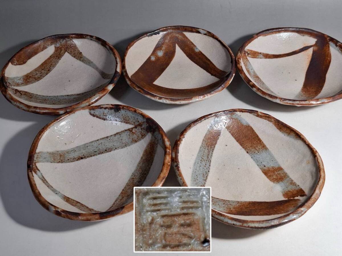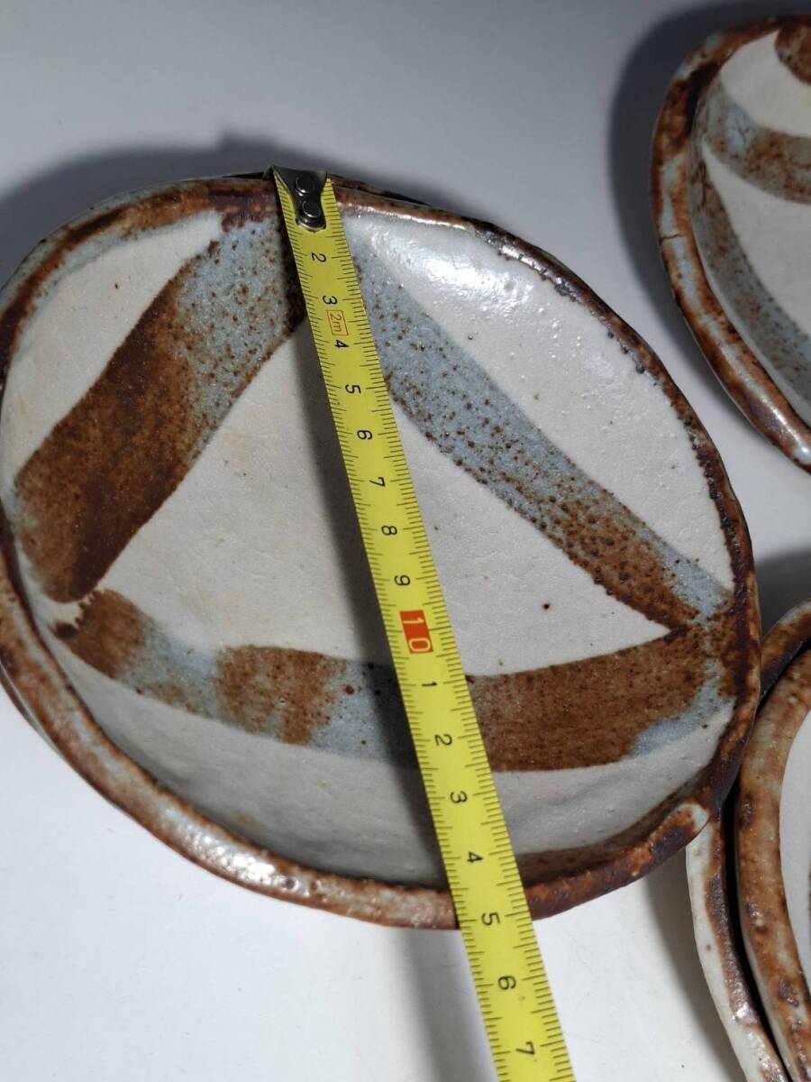 勝尾青龍洞の作品保証致します。陶印は青。不規則な歪みがあり赴き有ります。こちらの品物は青龍洞の親類の方より譲り受けた品物です。金銭に困った時に足しにすればよいと数点ずつ窯元より頂いた品物のようです。箱はありません。品物のみです。島根県からのうぶだし品です。直径約15㎝の三角紋丸皿5枚です。