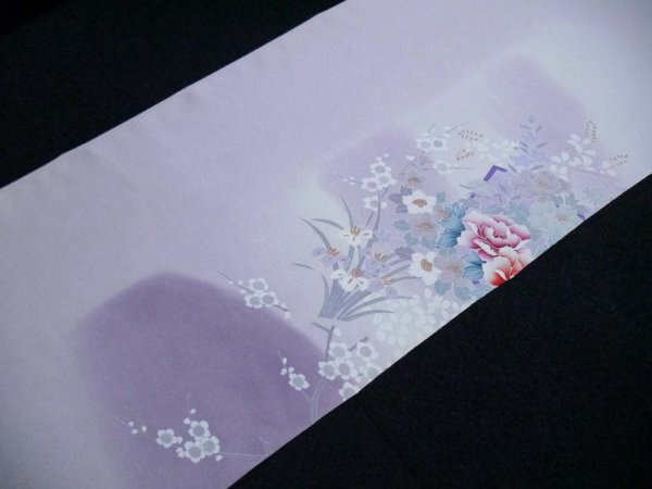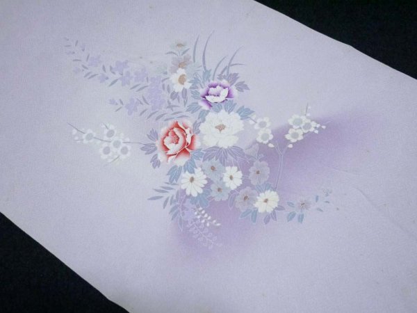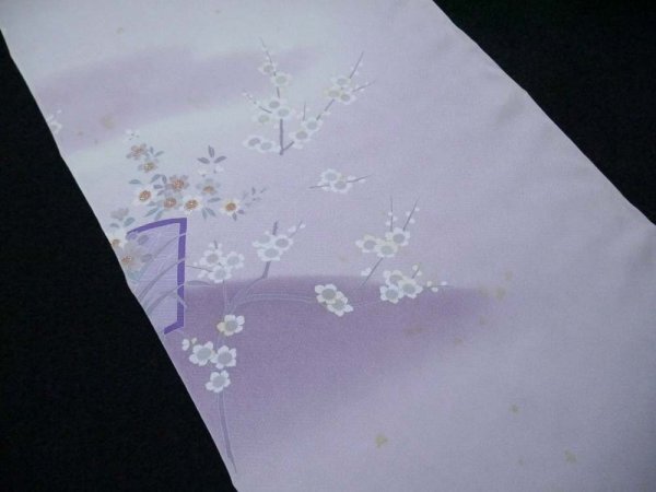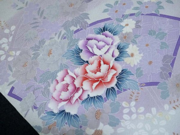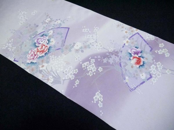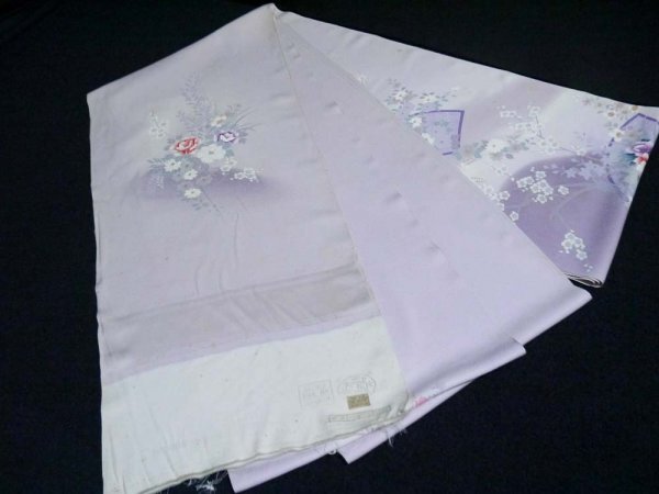 訪問着着物反物/薄ピンク・紫/扇面に四季の花意匠/紗綾形の地模様
