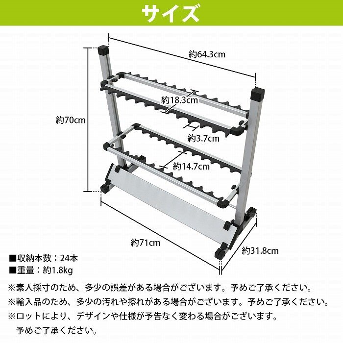 商 品 説 明 軽くて丈夫なアルミ製のロッドスタンドです! ロッド、竿24本を保管出来ます。 ロッドに触れる部分は強化スポンジ製で大事な竿に傷をつけません! ロッドサイズに合わせて上下スライド調整が可能♪