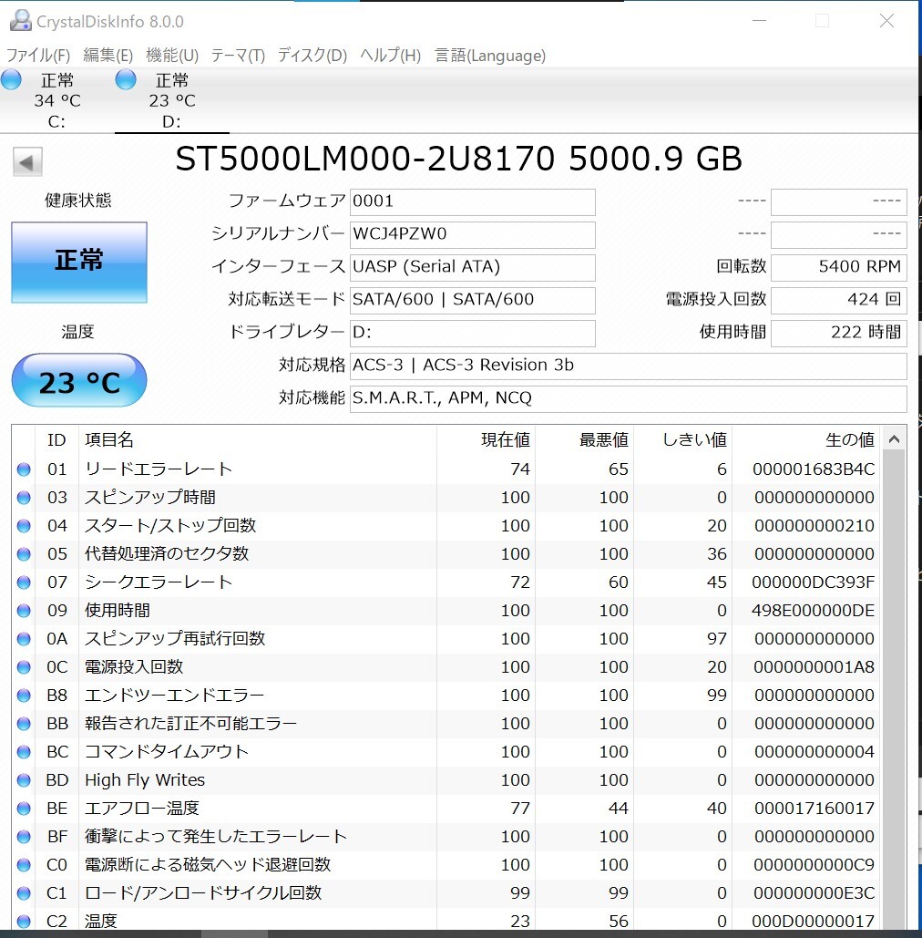 ☆【中古】 Seagate EXPANSION ポータブルドライブ 5TB 2.5インチ USB3.0 大容量 電源投入回数 424回 使用時間 222時間 ☆