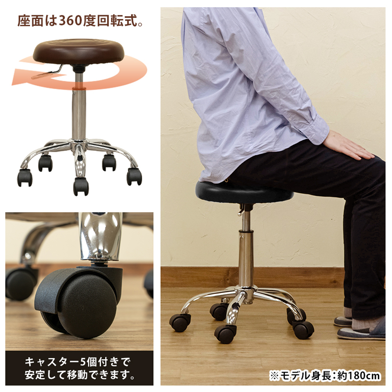 脚には移動のスムーズなキャスター付!座面も回転式で向きも自由に変えられます。