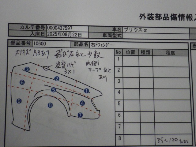 キズ情報 [全体、擦り傷、AB有][全体、飛び石、少数][、その他、内側、テープ跡、有][2、塗装ハゲ、3cm×1cm]