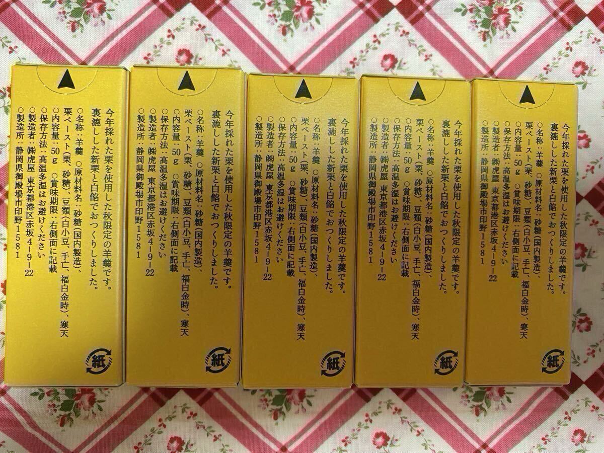 虎屋の美味しい羊羹の5本です♪ 販売期間が短い新栗羊羹は毎年人気です♪ お好きな方に♪ 箱無しでバラです。ミニ羊羹になります。 お裾分け用の虎屋の白の小袋や白の手提げ袋ご入り用方はコメントください。同封いたします。 ご希望がなければ同封致しませんのでご理解ください。 新栗羊羹50g×5本 賞味期限:2026年3月 虎屋のミニ羊羹をご存じのない方はお調べの上ご購入お願い致します。 百貨店での購入の正規品です。 送料は無料で発送いたします。 遠くて買いに行けない方に出品しています。 複数ご購入の場合はコメントいただければ、おまとめ発送致します。 送料の関係上出来ない場合もございますのでご理解の程よろしくお願いします。 *落札後、ご入金されない場合はキャンセルとさせていただきます。 (落札後ご入金せず嫌がらせをされる方がいらっしゃるため、その対策をとらせていただいております。) ご理解の程よろしくお願いいたします。 ※商品内容や説明をコピペまたは真似て書かれてる方がいらっしゃいます。もちろん画像も転載禁止です。 発見した場合は直ちに事務局へ通報及び対処していただきます。十分にお気を付け下さいませ。 #虎屋 #とらや #虎屋羊羹 #虎屋の羊羹 #とらやの羊羹 #虎屋ようかん菓子 #虎屋羊羹菓子 #虎屋季節限定羊羹 #虎屋栗蒸し羊羹 #季節限定羊羹 #栗蒸し羊羹 #新栗羊羹 #栗羊羹 #虎屋京都限定羊羹 #虎屋京都限定黒豆黄粉羊羹 #虎屋京都限定白味噌羊羹 #京都限定 #京都限定品 #和菓子 #生菓子 #羊羹 #お菓子 #おうち時間 #登山 #ハイキング #旅行 #京都土産 #京都お土産 #プレゼント #お裾分け #アウトドア #キャンプ #ポイント購入 #クーポン利用 #虎屋新栗羊羹 #虎屋栗羊羹 >