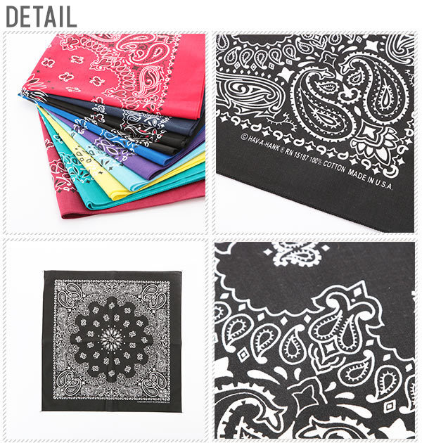 | 商品説明 | ハバハンクより、定番のペイズリーパターン♪お気に入りのバッグやお洋服に合わせて、いつものコーデをぱっと華やかに!バッグのアクセントに、首回りにささっとかわいく巻いたり、ハンカチとして!お弁当を包んだり、使い方は自由自在で楽しめます!1枚持っているだけで華やぐ便利な1枚です♪ |