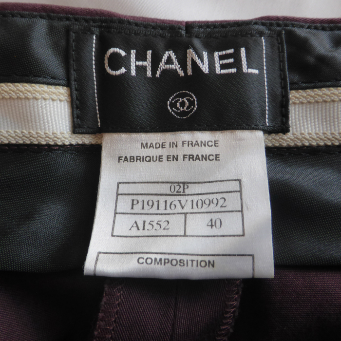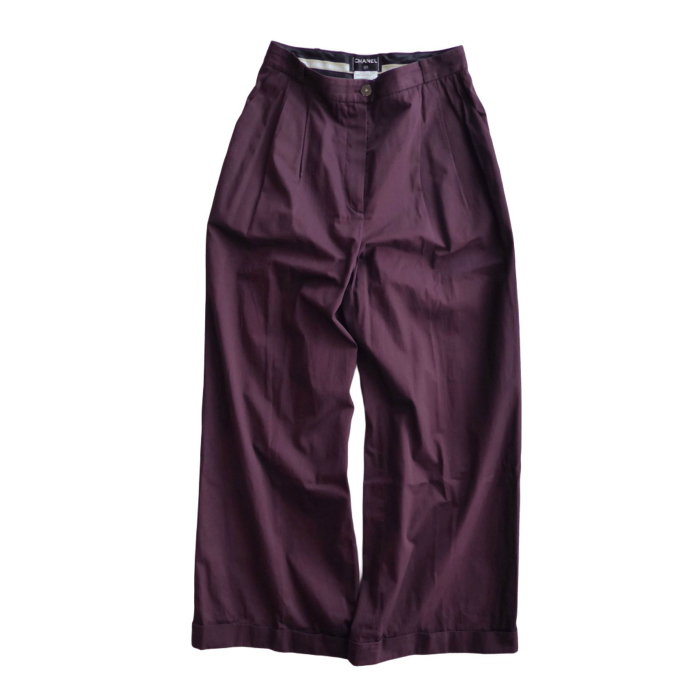 | シャネルのコットンパンツ。 2タックデザインの太さのあるバギーシルエット。 裾はダブル仕上げのクラシカルな印象です。 赤みの強いパープルのお色味は他にない絶妙な色彩です。 フロントのココマークが刻まれたオリジナルボタンがメンズライクな見た目を払拭し、エレガントな仕上がりです。 |