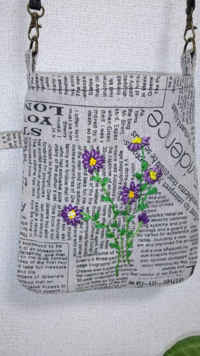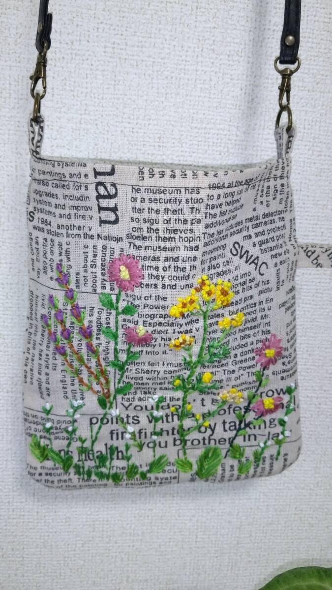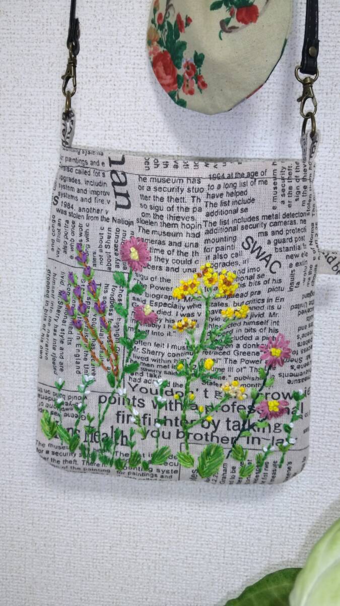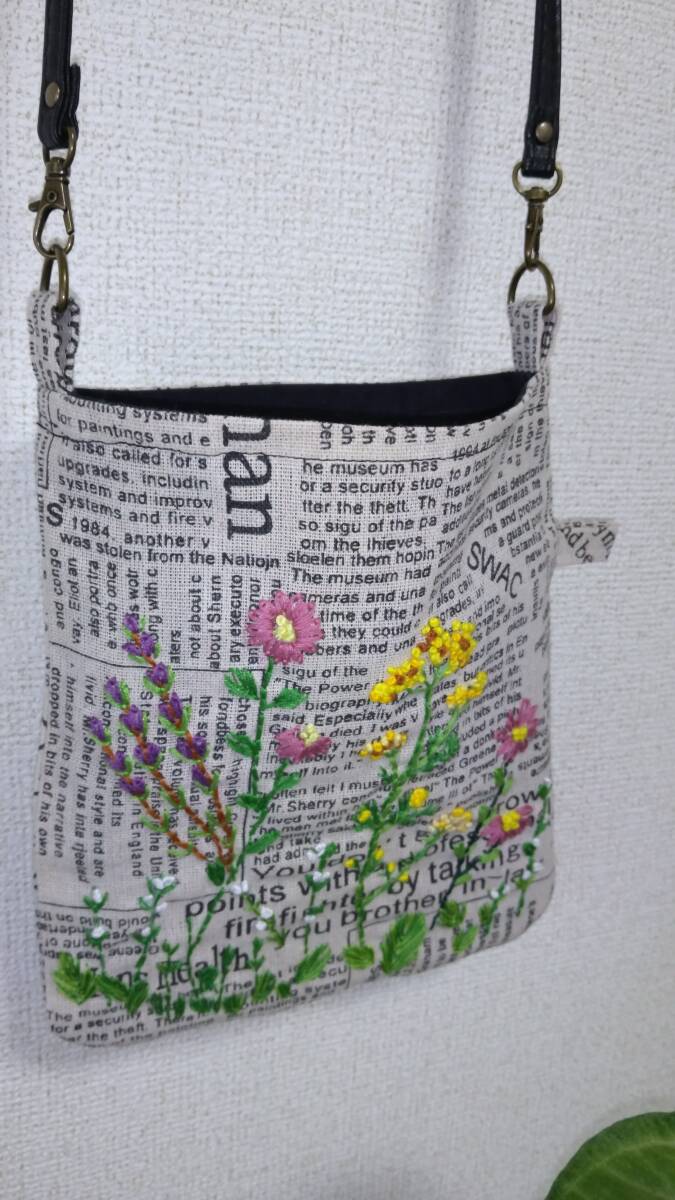 ハンドメイド・オンリーワンのバック・手刺繍・リネン・デイル・ブルーデイジー・ハーブ・手刺繍ショルダー/斜め掛けバック