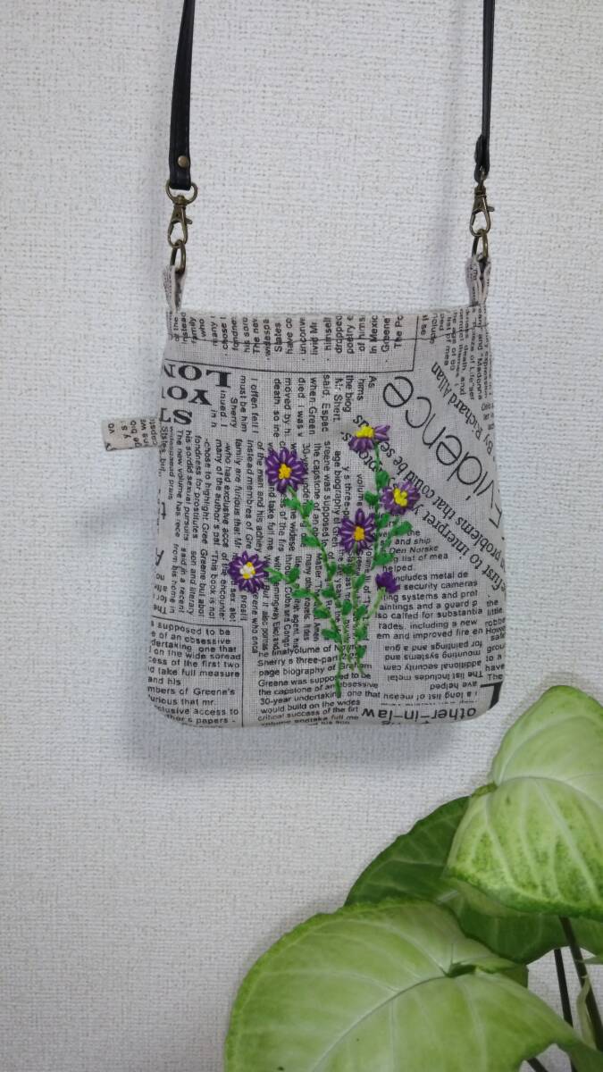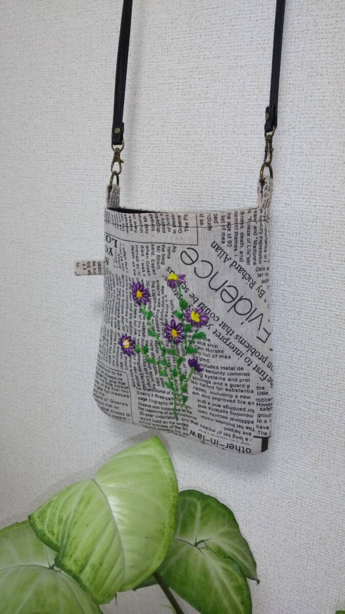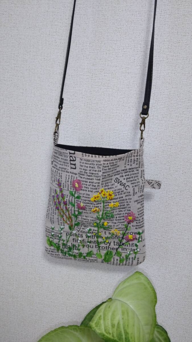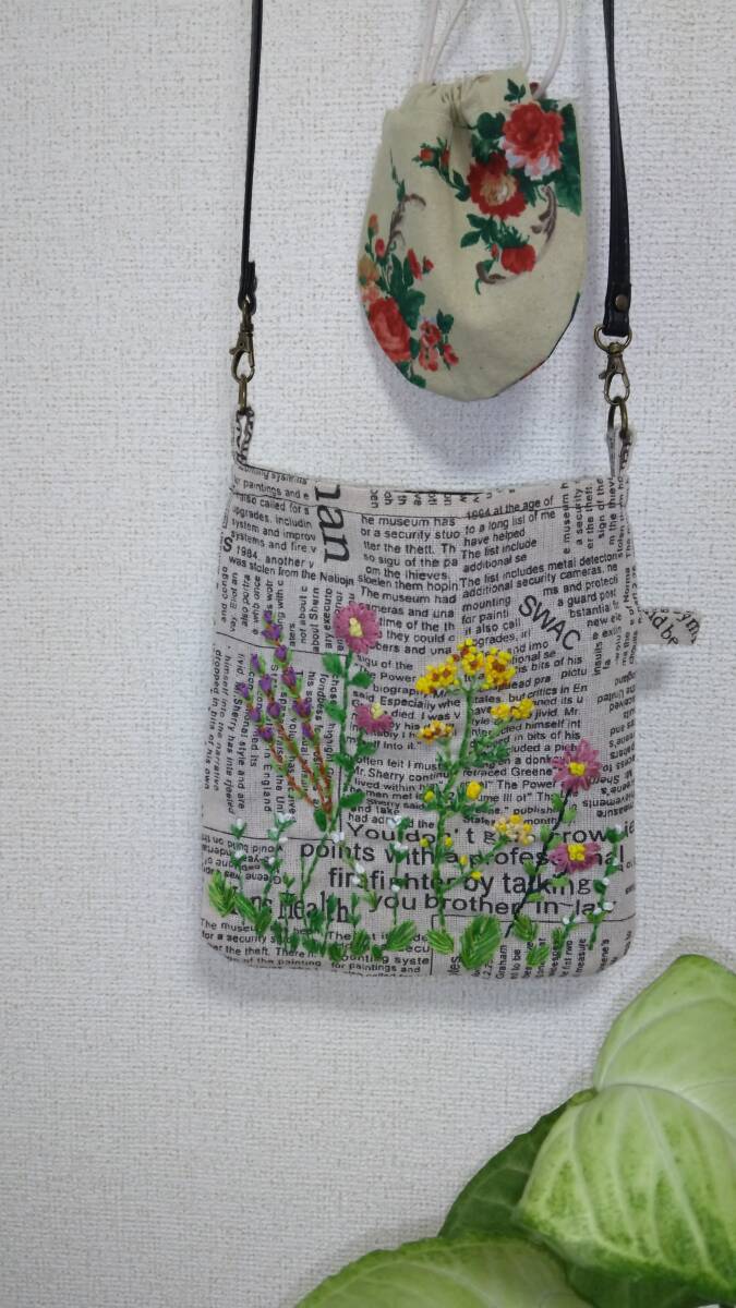 ハンドメイド・オンリーワンのバック・手刺繍・リネン・デイル・ブルーデイジー・ハーブ・手刺繍ショルダー/斜め掛けバック