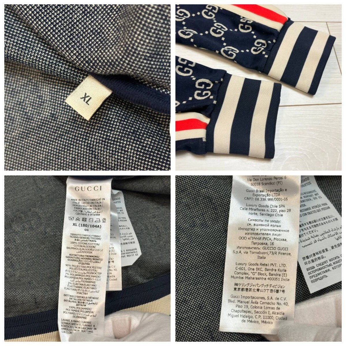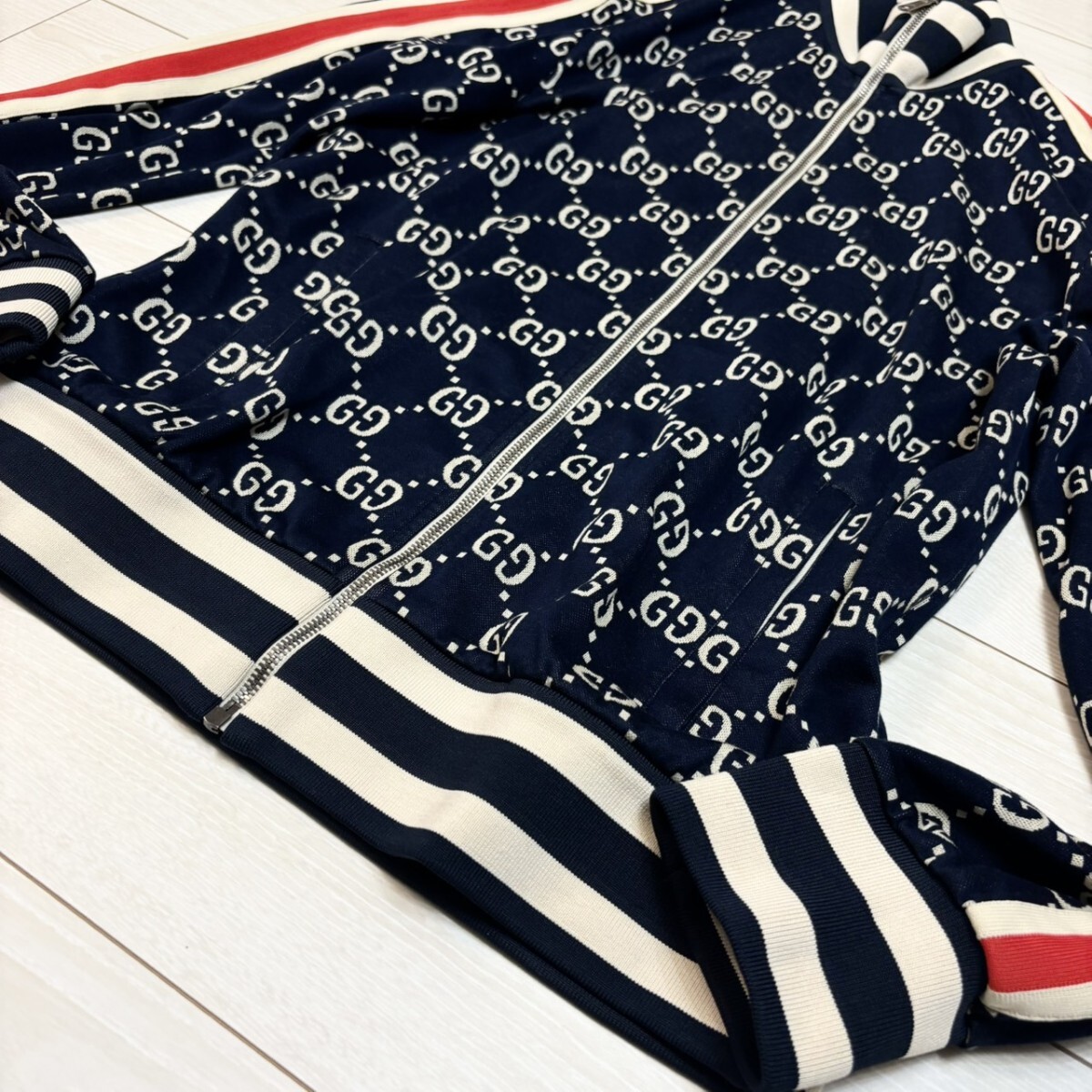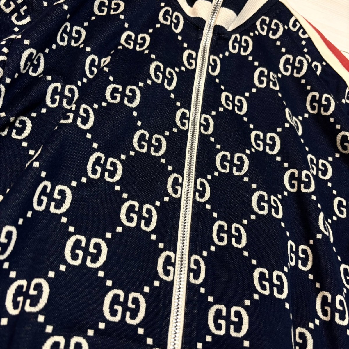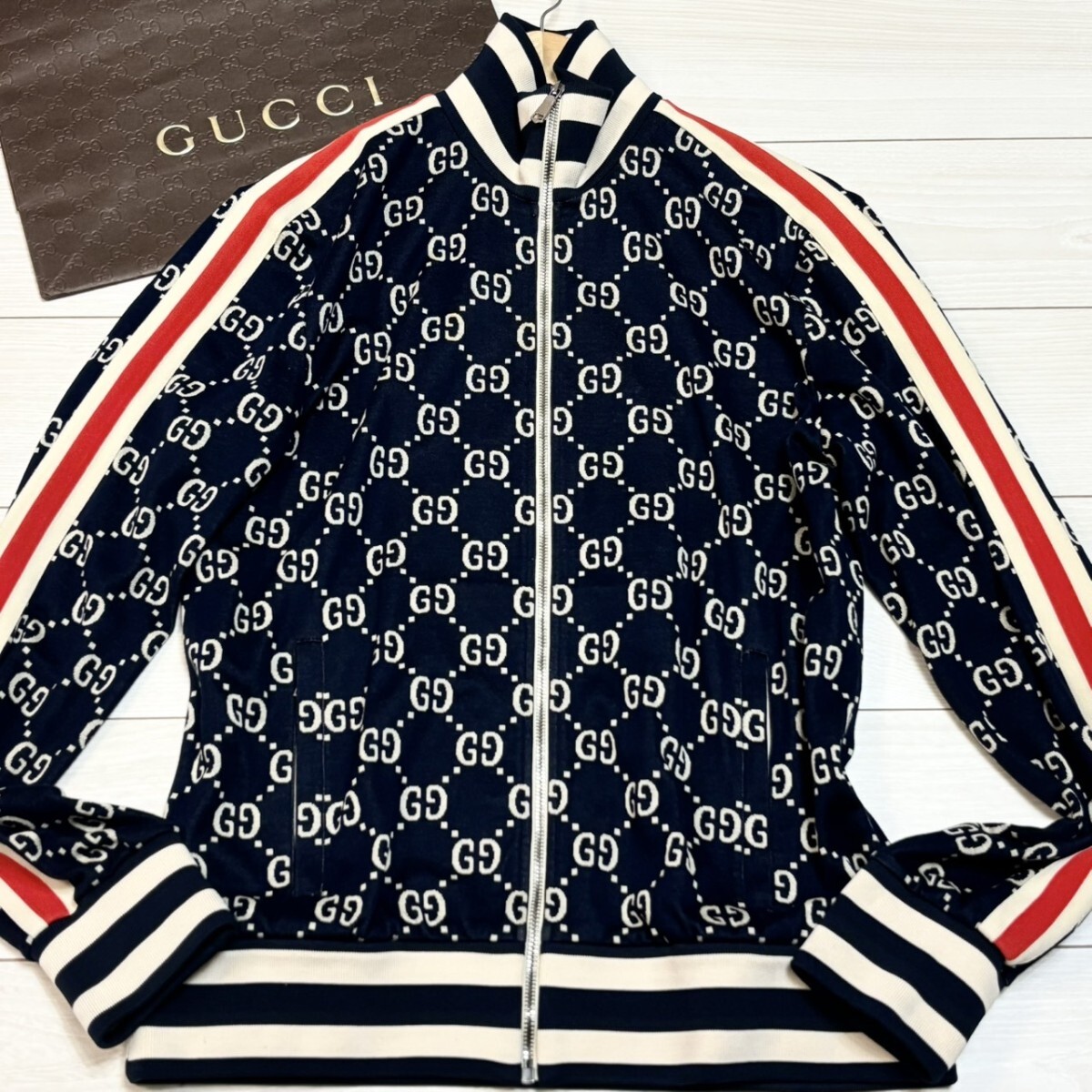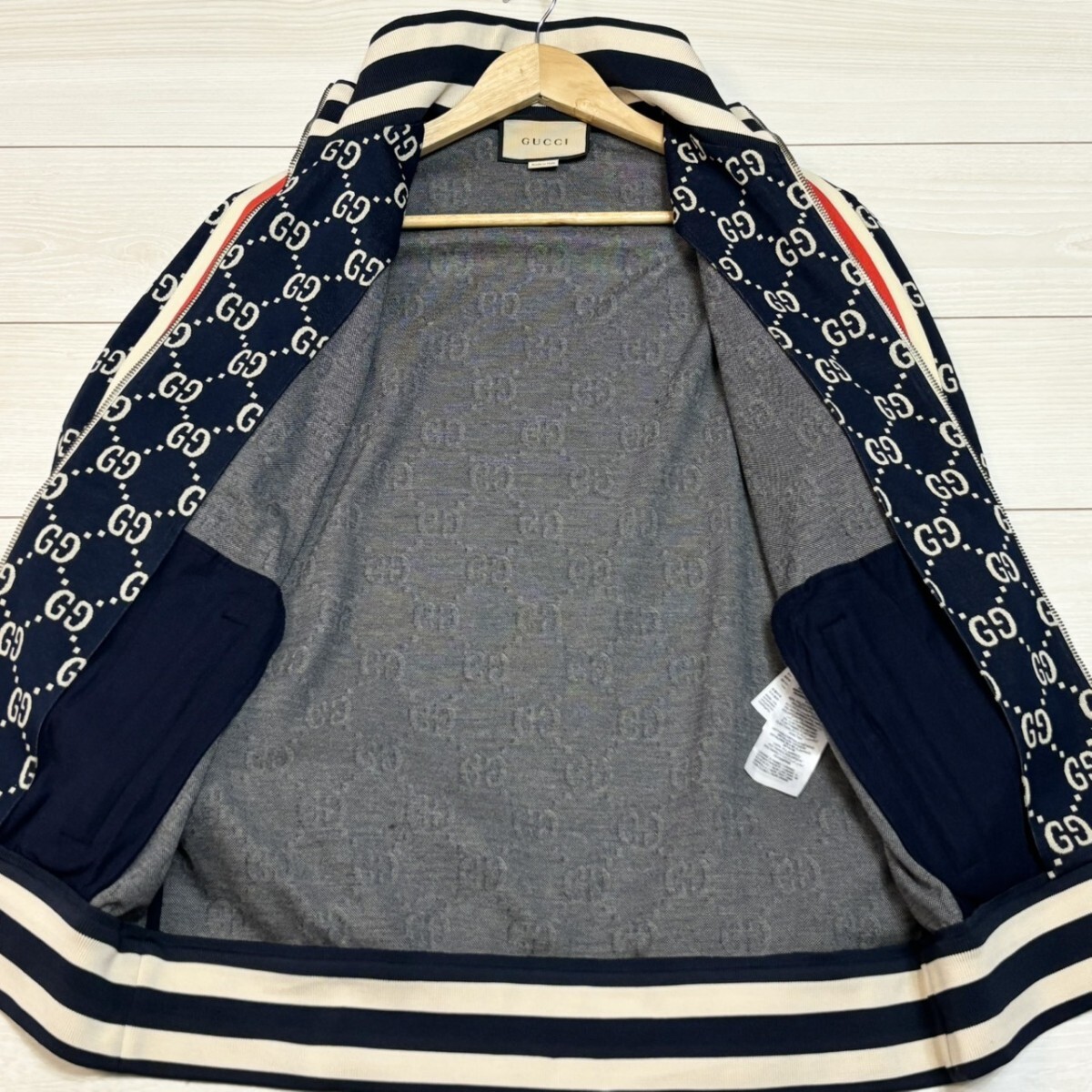 未使用級/XLサイズ●GUCCI グッチ トラックジャケット GGジャガード コットン ジャージ 総柄 ネイビー ベージュ メンズ アウター 春秋冬