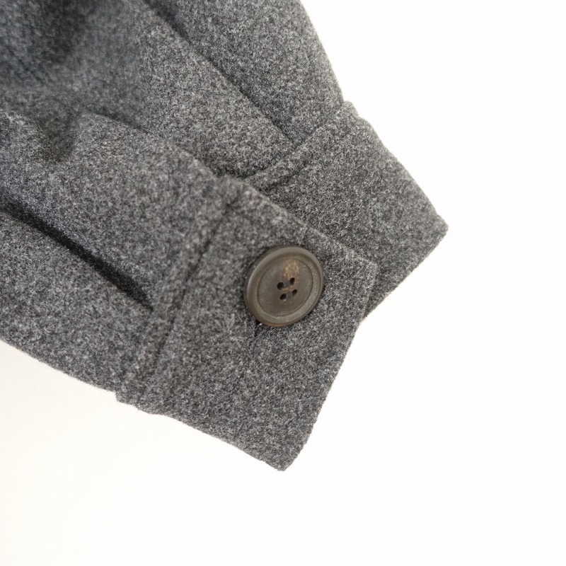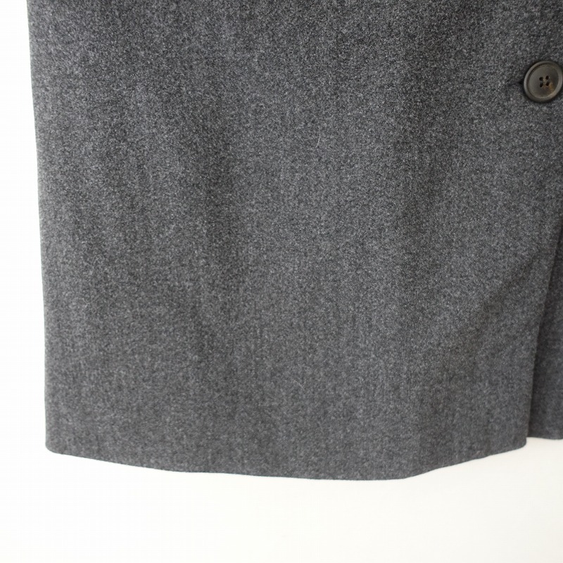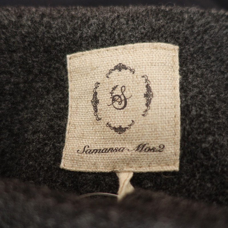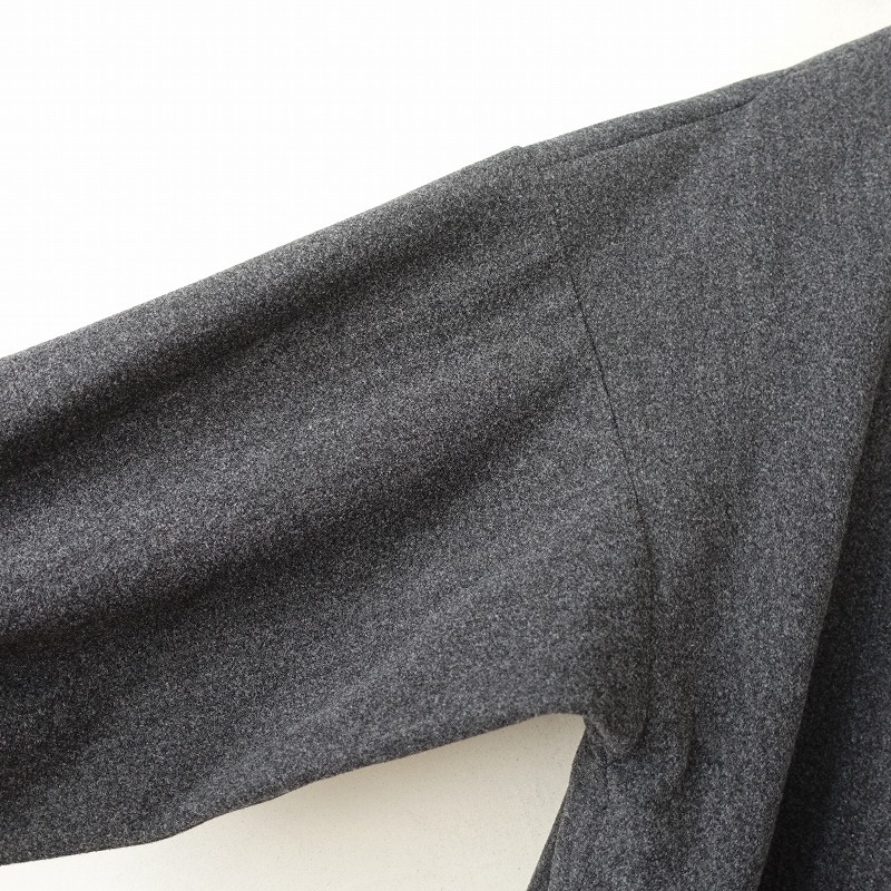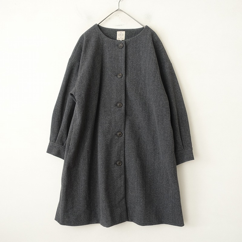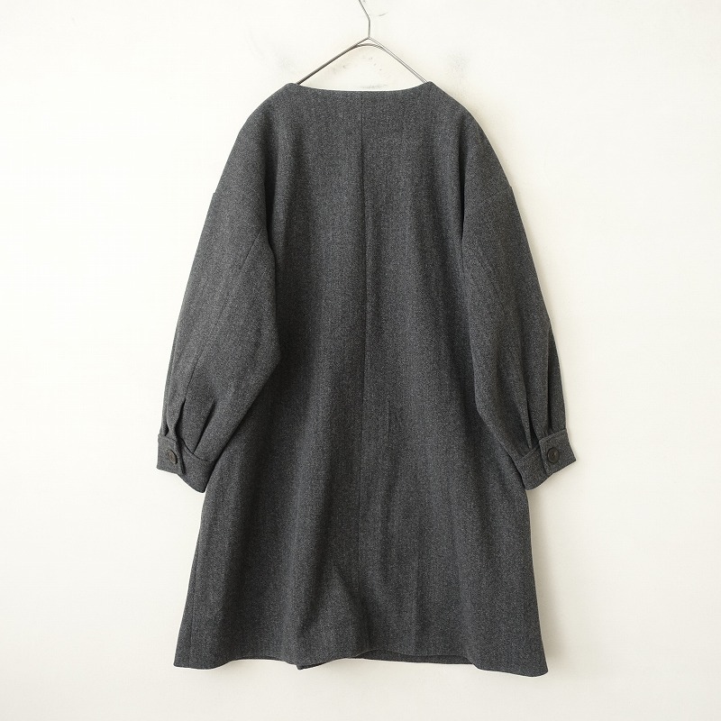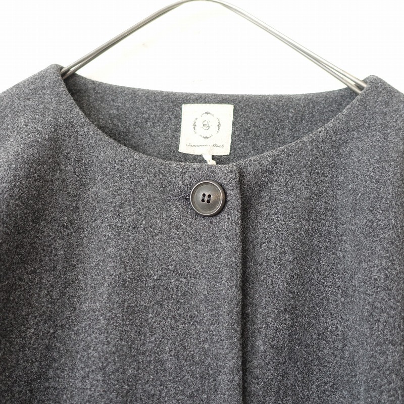 | Samansa Mos2 のノーカラーロングコートです。カラーはチャコールグレーで、ライトメルトンのような生地で仕立てられており、裏地が付いております。フロントボタン開閉で着脱でき、両サイドにシームポケットが付いております。 |
