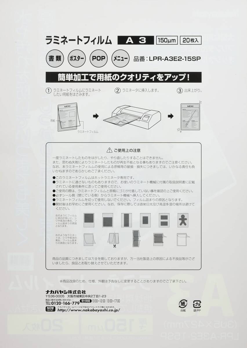 150 20枚入りレッド/A3/LPR-A3E2-15SP ・PatternName:単品Style:150 20枚入り ・パッケージ個数:1 ・A3 ・20枚入 ・ハリのあるPET材ベースのフィルム 商品紹介 ●焼却しても有害物質が発生しない、地球環境に優しいラミネートフィルムです。 ●150μm対応のラミネータで使用ください。 ●ラミネートできる紙の最大厚みは0.5mmまでです。 参考価格として表示しているのは商品発売時点でのメーカーの想定した価格です。 【必ずご確認下さい】 ●発送に関して● 全国一律送料無料 ●落札、購入後のご挨拶等は不要です。大変恐縮ですが、業務効率化のためご協力の程よろしくお願い致します。 ●お届け方法 アマゾン社配送サービス(FBAマルチチャネルサービス)/ヤマト運輸/日本郵便等/佐川急便/楽天ロジスティクス(RSL)/大手下請け配送 ※配送会社の指定はできませんのでご了承ください。 ●ご入金より当日〜3日前後での出荷になります。 土日祝日も発送致します。 天候、注文量の増加、等の理由により遅延が発生する場合がございます。 お急ぎの方のご注文はトラブルとなる恐れがありますので、ご遠慮下さい。※非対面配達を推奨している関係上、【置き配】での配送になる場合がございます。 ●お支払いに関して● ● 落札後、お支払い完了後に在庫引き当て作業を行います。 お支払いまでに時間がかかる場合は商品をご用意する事が出来なくなってしまう恐れがございます。早目のお支払いをお願い致します。 落札後3日以上経過してもお支払いをされない場合はキャンセルにて対応をさせて頂きます。 ●お支払いはクレジットカード決済・PayPay残高払い・PayPayあと払いがご利用いただけます。 ●かんたん決済、銀行振込、コンビニ払い等には対応しておりません。 ご了承下さい。 ●領収書ご希望の際は、購入後取引メッセージよりご連絡をお願い致します。(商品への同梱は致しておりません。) ●同じ商品を2個以上ご希望のお客様へ オークション形式での出品では、在庫がある場合でも「数量1」のみを出品しております。 お支払い完了後、取引メッセージより数量変更の旨ご連絡下さい。在庫確認後、金額変更をさせて頂きます。 (在庫数が足りない場合は在庫分のみの発送となります。) ●返金に関して● ●お客様都合による商品の返品および交換は承っておりません。 ●商品の欠陥や不良など弊社原因による場合には返品・交換をお受けします。 但し、衛生用品や、食品関係につきましては商品の性質上、返品はお受けできません。 ●商品到着後7日以内にご連絡を頂いた場合に限り対応致します。 ●注意事項に関して● ●賞味期限について 基本的には30日以上賞味期限がある商品を販売しており、30日が経過した時点で販売中止、及び破棄をしております。(通常消費に問題がない期限の物をご用意しております。) ご質問頂いても具体的な期限の回答は出来かねますのでご了承下さい。 商品画像、商品説明はメーカー等より引用して掲載しております。画像、説明文等に賞味期限の記載がある場合でも本ご案内が正しい内容となります。予めご了承下さい。 ●購入手続きが出来ない 下記内容のご確認をお願いします。チェック項目のご確認 ストアからの確認事項と言う項目がございます。変更ボタンをクリックし、内容をご確認の上、「確認、了承した。」の項目にレ点をお願い致します。 上記にて解決しない場合は、取引メッセージよりご連絡下さい。 ●電話・メールでの対応は原則しておりませんので、「取引メッセージ」 よりご連絡をお願い致します。 ●商品内容のサポートは行っておりません。 ●商品販売後の修理、お問い合わせ等はメーカー、修理店等へお願い致します。 ●掲載商品は、メーカーのリニューアルに伴い、パッケージ・香り・サイズ・内容・成分・容量等が予告なく変更される場合がございます。予めご了承下さい。 ●メーカー様、卸業者様へ● 知的財産権(商標権、意匠権、著作権等)に抵触しないようチェック体制を整えております。 万が一、該当する事がございましたら、大変お手数ですが下記メールアドレスまでご連絡頂けますでしょうか。meex-info@ruruju.net 何卒宜しくお願い致します。