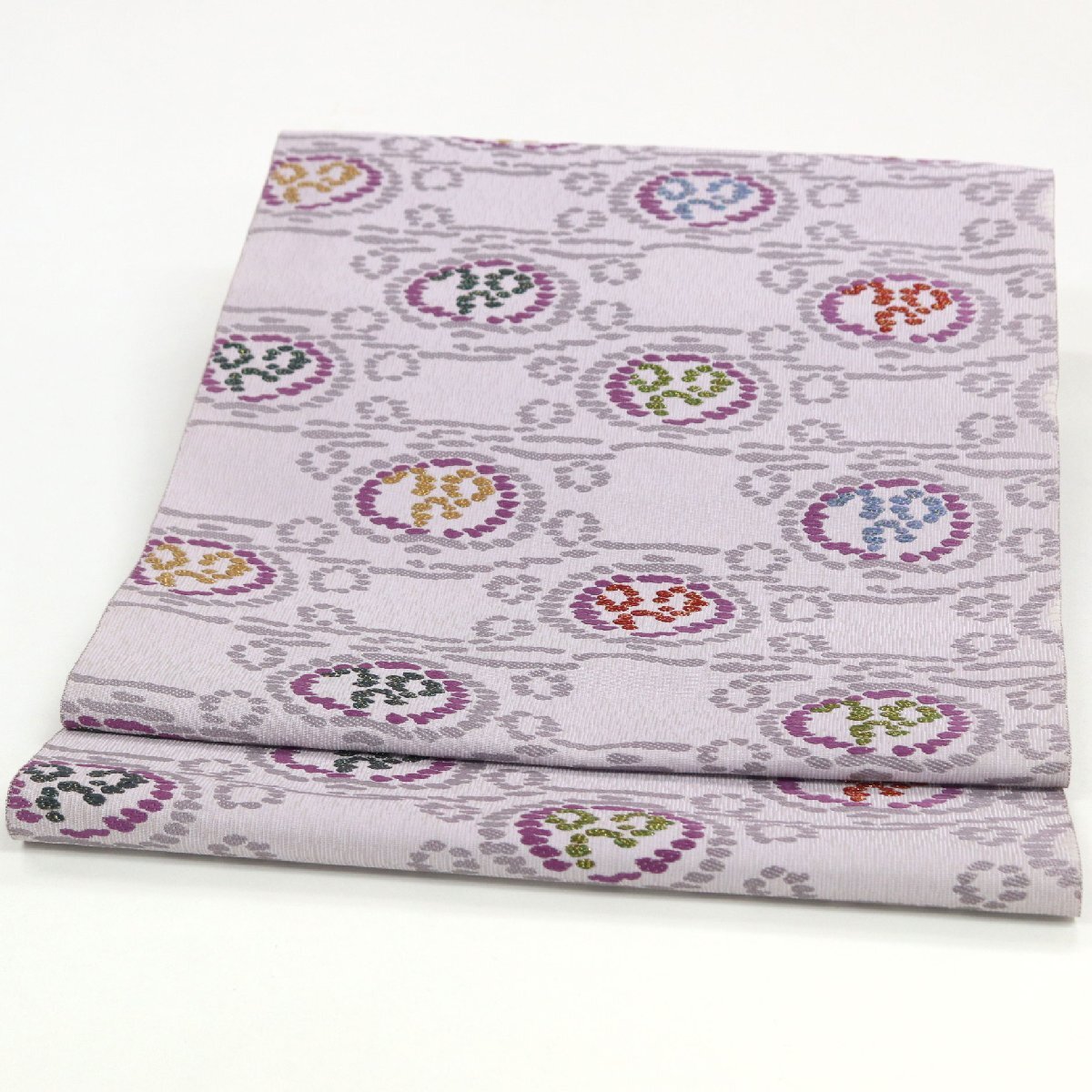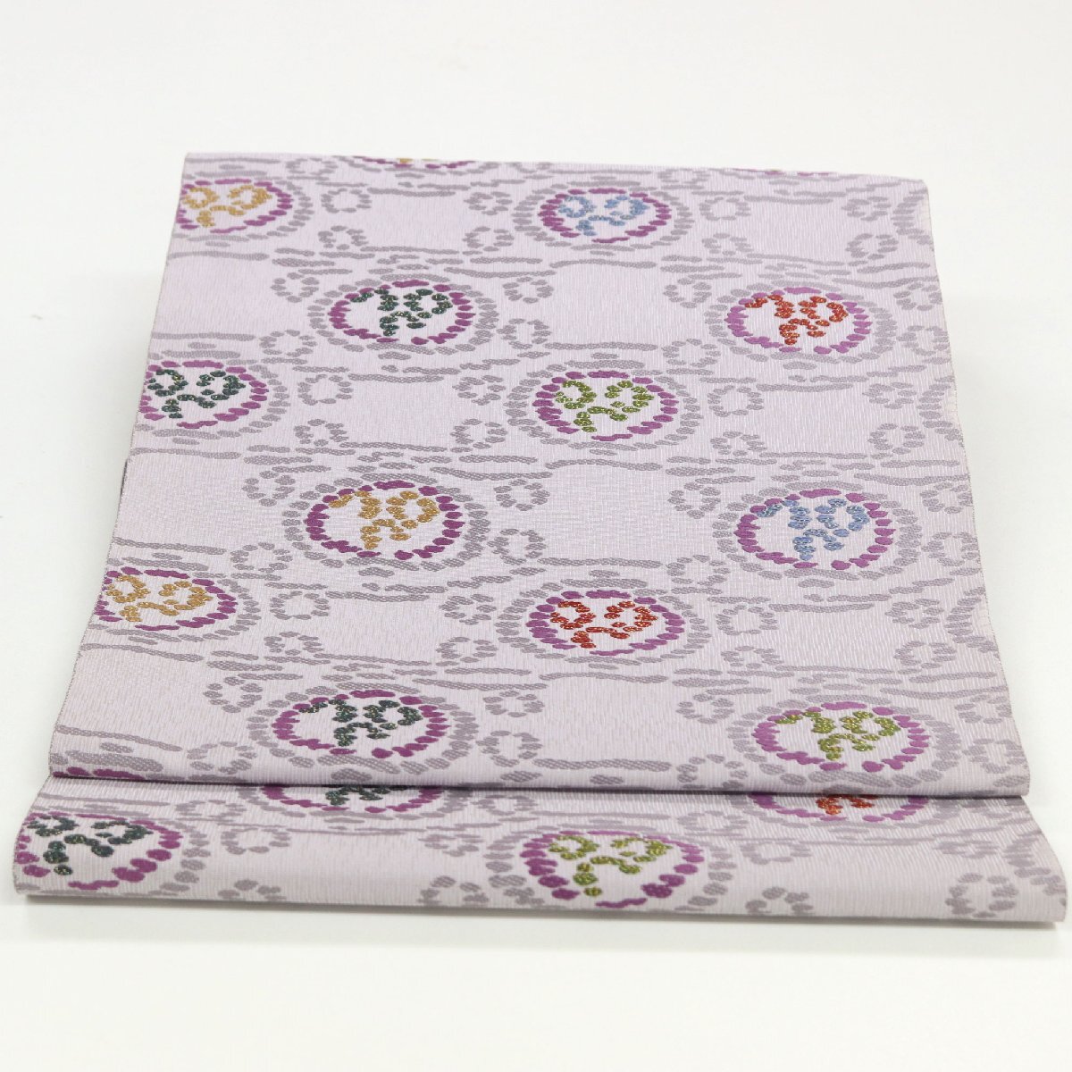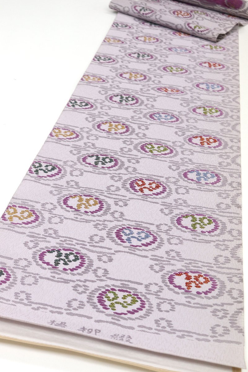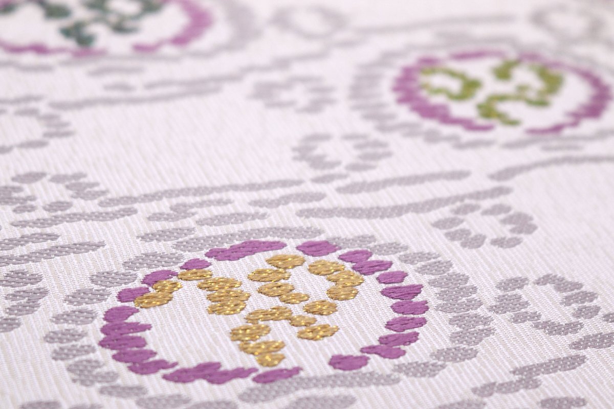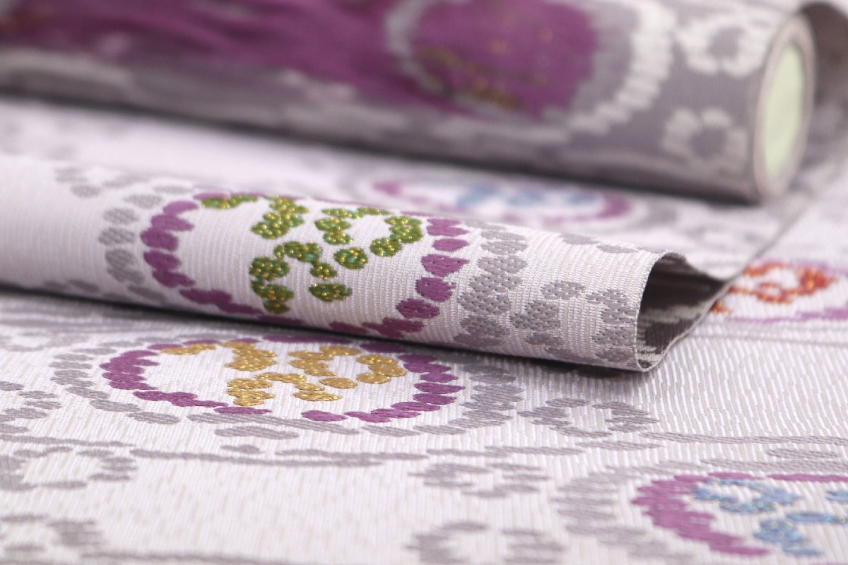 紫色、草色、紺色、山吹色などのお色目で鳳凰の丸文が織り上げられております。