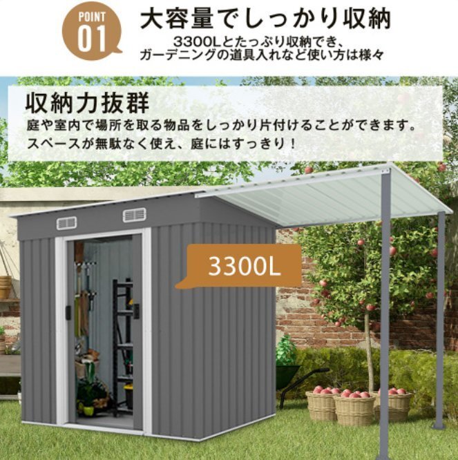 【大容量でしっかり収納】たっぷり収納でき、ガーデニングの道具入れなど使い方は様々収納力抜群庭や室内で場所を取る物品をしっかり片付けることができます。スペースが無駄なく使え、庭にはすっきり! 【しっかりとした頑丈なスチール素材】ハイテンション亜鉛メッキ鋼板採用!紫外線に強く、錆びにくく、水にも強い仕様です。防水・防錆効果が優れている! 【外部からの強度を高める凹凸のある壁面】壁面の鉄板は、凹凸形状を付けております。通常商品の平たい壁面と比べて、外部からの衝撃を分散し、安定感が強くなっています。 【屋根の溝は排水に役立つ】内部は濡れないために、斜面を設計しました。雨が降ると、屋根にたまることなく、斜面と凹槽を経由して地面に流れ落ちます。湿気から工具を守る頑丈で耐久性があり、変形しにくい、悪天候から内部の物品を保護します。 【施錠可能 引き戸タイプ両開きドアー】邪魔なく スムーズに開閉移動式のドアが付いており、スペースを取らず、荷物の出し入れがもっと簡単!お客様が自身で取っ手に施錠できるので、中の物品を安全に保管できます。 【二つ換気口が付き】空気の流れを維持することで、湿気やカビの発生を防ぎ、錆や損傷を防止します。 【床材補強フレーム付き】①構造安定:補強フレームはしっかりとした基礎を提供し、安定性を高め、沈下や傾きを防ぎます。②防湿・防水:プラスチックまたは木製の床材を敷くことで、防水効果を発揮します③耐震性能:地震や台風の際に力をよりよく分散・吸収し、構造的な損傷のリスクを減らします。(アンカー工事は必ず行ってください。) 新品は未使用で、色とサイズは上の図の通りです