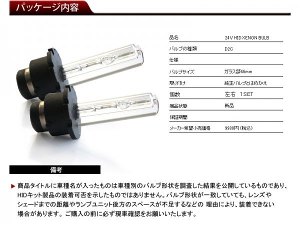 | ジェネレーションキャンター(ジェネキャン) ◆PHILIPS(フィリップス)社のOEM商品 TCマークのフィリップスの採用する事で長寿命を実現しました。 発光部は通常より大きく膨らんだ状態になっています。 これにより 安定した高輝度を実現しました。もちろんUVカット クリスタルガラスですのでレンズ焼けを未然に防ぎます ◆ISO認定工場にて生産のため高品質! 無駄なマージンをカットすることにより実現した低価格。 ハロゲンバルブのようにフィラメントを発光させるのとは違い バーナー内に密封させた特殊ガスを高電圧で放電させることで 発光させる、ハロゲンバルブに替わる新しいシステムです。 商品 :トラック用 純正交換用HIDバーナー 規格 :D2C(D2S/D2R) 35W 色温度 :6000k 特徴 :ISO9001認定、保護基準適合Eマーク取得工場で生産 入力電圧:24V 個数 :左右2個1セット 状態 :新品・未使用品 ■ケルビン数をお選び下さい。 6000K 8000K 2000K 30000K ご入札時にご希望のケルビン数をご連絡下さい。 連絡がなければ6000Kにて対応させていただきます。 ・商品のイメージ違い・色違い・サイズ違い等、お客様都合によるご交換は出来かねます。 ※必ず現車確認後のご購入をお願いします。 ・クリアランス不足の取付不可、台座の加工などはご購入様の責任において管理をお願いします。 | |||