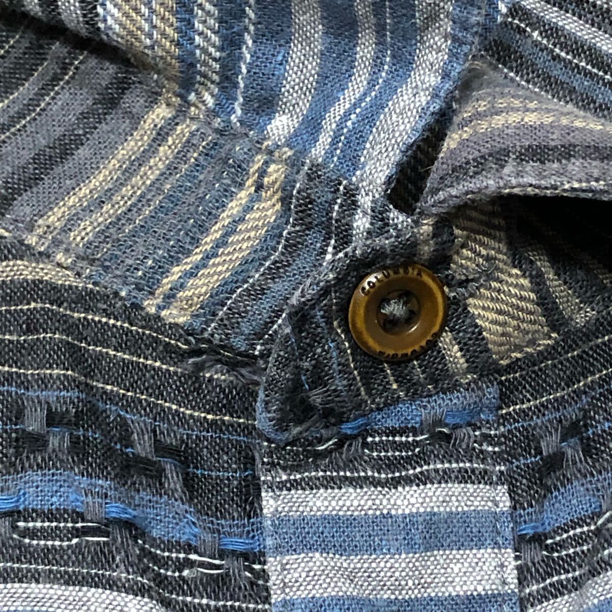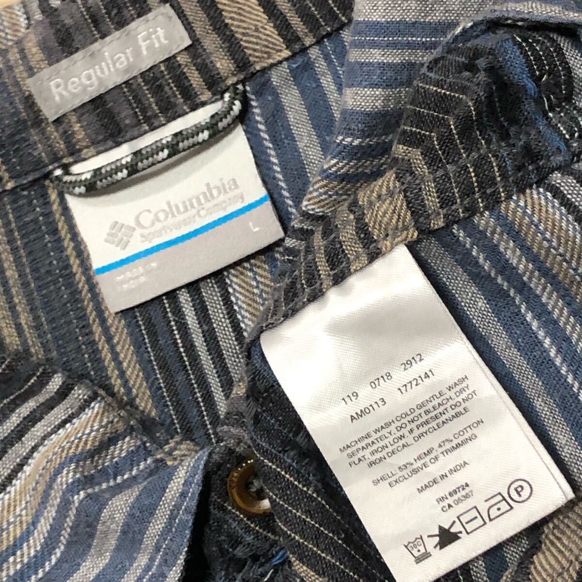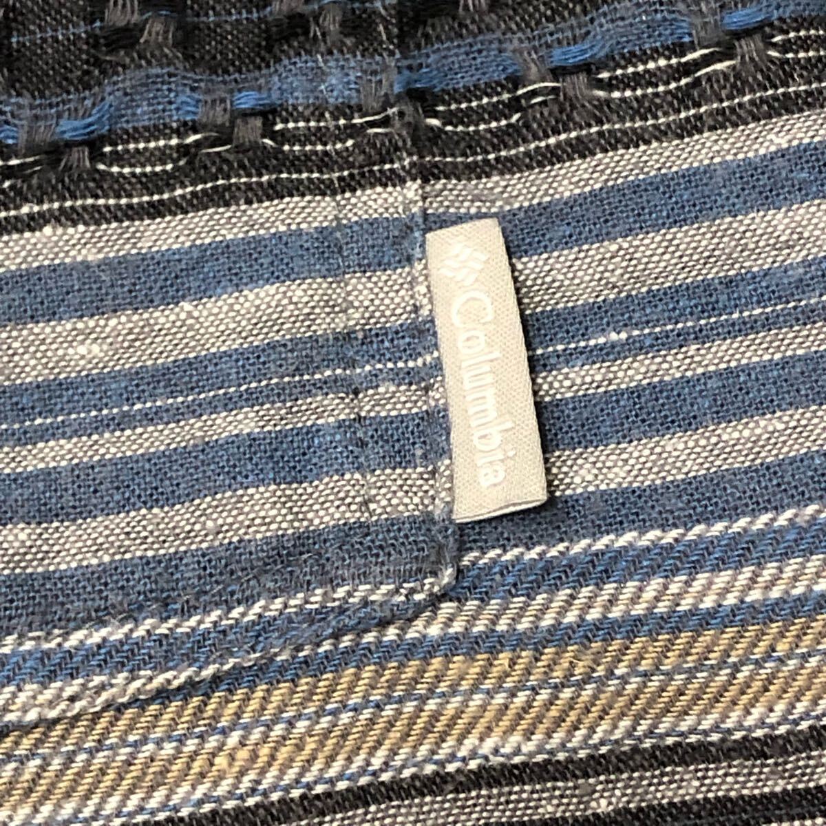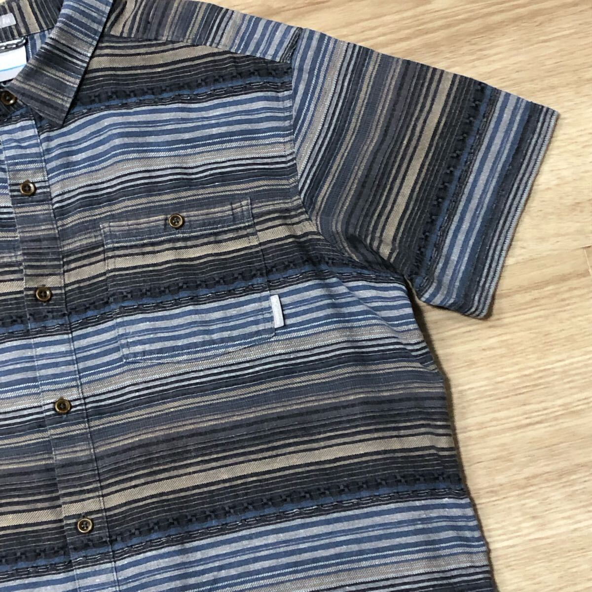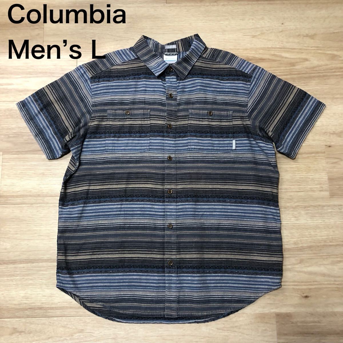 【送料無料】Columbia半袖シャツ ネイビー系ボーダー柄 メンズLサイズ コロンビアアウトドアシャツ登山