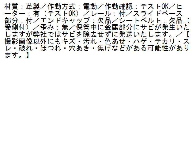 | 商品情報 | 材質:革製/作動方式:電動/作動確認:テストOK/ヒーター:有(テストOK)/レール:付/スライドベース部分:付/エンドキャップ:欠品/シートベルト:欠品(受側付)/歪み:無/保管中に金属部分にサビが発生いたしますが弊社ではサビを除去せずに発送いたします。/【撮影画像以外にもキズ・汚れ・色あせ・ハゲ・テカリ・スレ・破れ・ほつれ・穴あき・焦げなどがある可能性があります。】 | ||