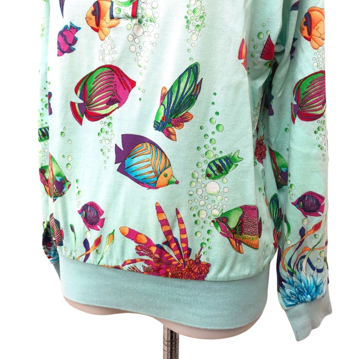 9K334-25 LEONARD レオナール SPORT スポーツ 長袖 ポロシャツ トップス 魚 海 総柄 コーラルブルー 水色 系 レディース 女性用 L