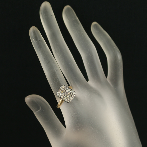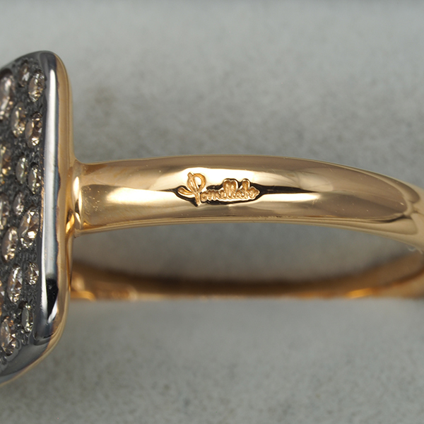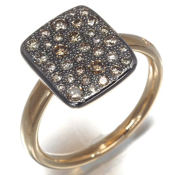 艶やかなピンクゴールドと美しいコントラストを奏でるバーニッシュ加工されたスクエアモチーフへ大小の上質ブラウンダイヤモンドをパヴェセッティングしたポメラートのサッビアリングです。 |