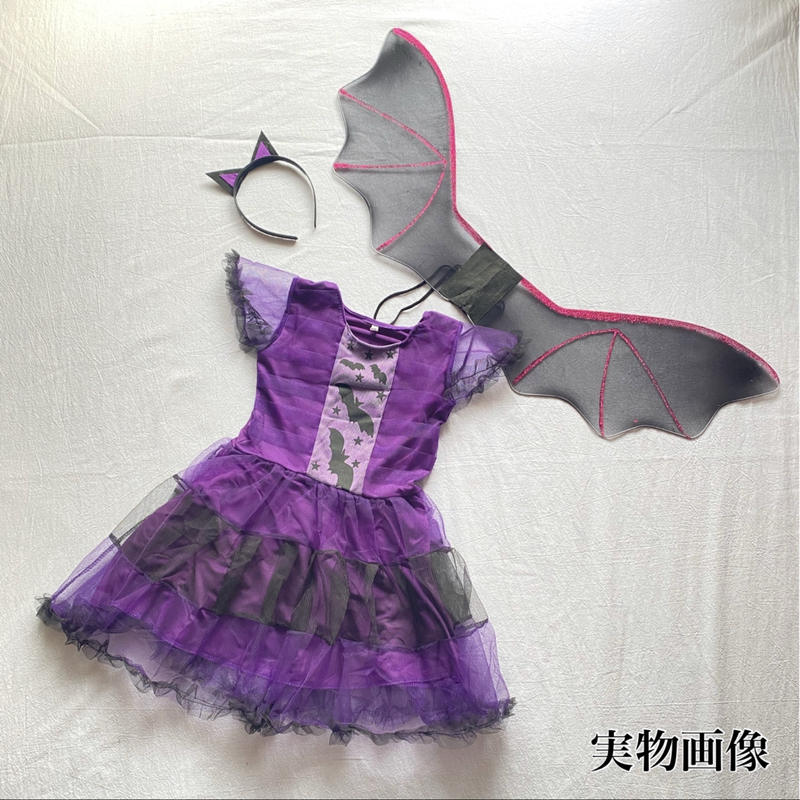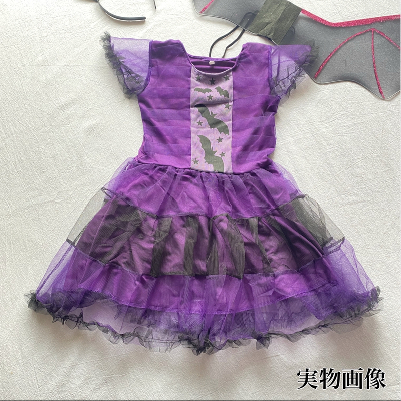 紫 と 黒 の チュールドレス で ふわふわ と 可愛い イタズラっ子な感じの 悪魔 デビル な キッズ用 のコスプレ 衣装です