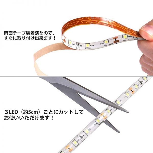 ■消費電力:4.8W/m ■防水等級:IP65(テープ部分) ■ベースカラー:ホワイト ■サイズ:全長5メートル,幅: 8mm、厚さ:2mm 両面テープ装着済なので、すぐに取り付け出来ます! 3LED(約5cm)ごとにカットしてお使いいただけます! プラスとマイナスの配線に繋いでいただくだけで点灯します! 防水等級はIP65なので、屋外でも使えます、ショーケースや看板や車の装飾に良く使われています。テープ部分は防水ですが、接続部分は完全防水ではありませんので、ご注意ください。 LEDを使用しているため、低消費電力で長寿命で環境にも優しい照明です。