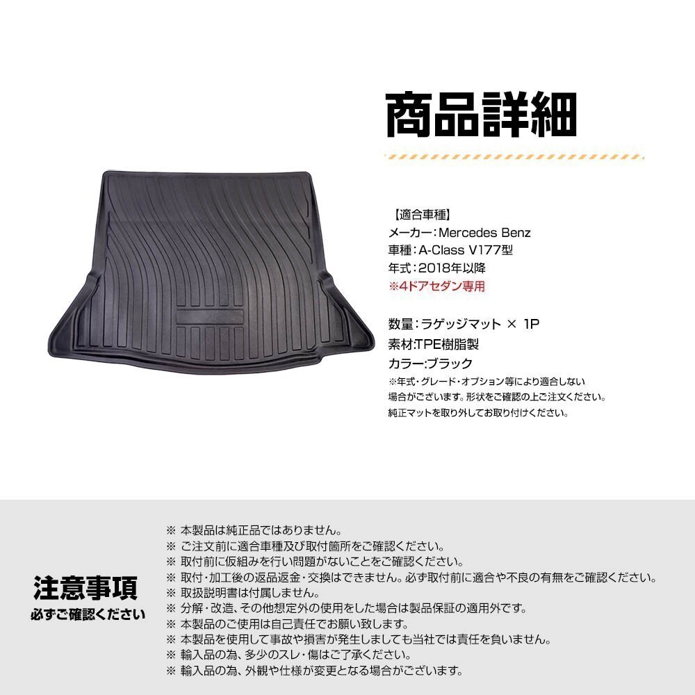 車種別専用設計(4ドアセダン専用) 【適合車種】 メーカー:Mercedes Benz 車種:A-Class V177型 年式:2018年以降 【商品仕様】 数量:ラゲッジマット × 1P カラー:ブラック 素材:TPE樹脂製 備考:トランクルーム用 取付注意:純正オプションのマットを取り外してお取り付けください。 注意事項:年式・グレード・オプション等により形状が異なる場合がございます。必ず実車の形状をご確認の上ご注文ください。 ※ 梱包資材のサイズにより丸めた(折畳んだ)状態で発送となる場合がございます。到着時の商品の一部が丸まっていたり折り目がついた状態となってしまっている場合がございますが、数日で形状が戻ります。ドライヤーで温めたりすることで形状が戻りやすくなります。