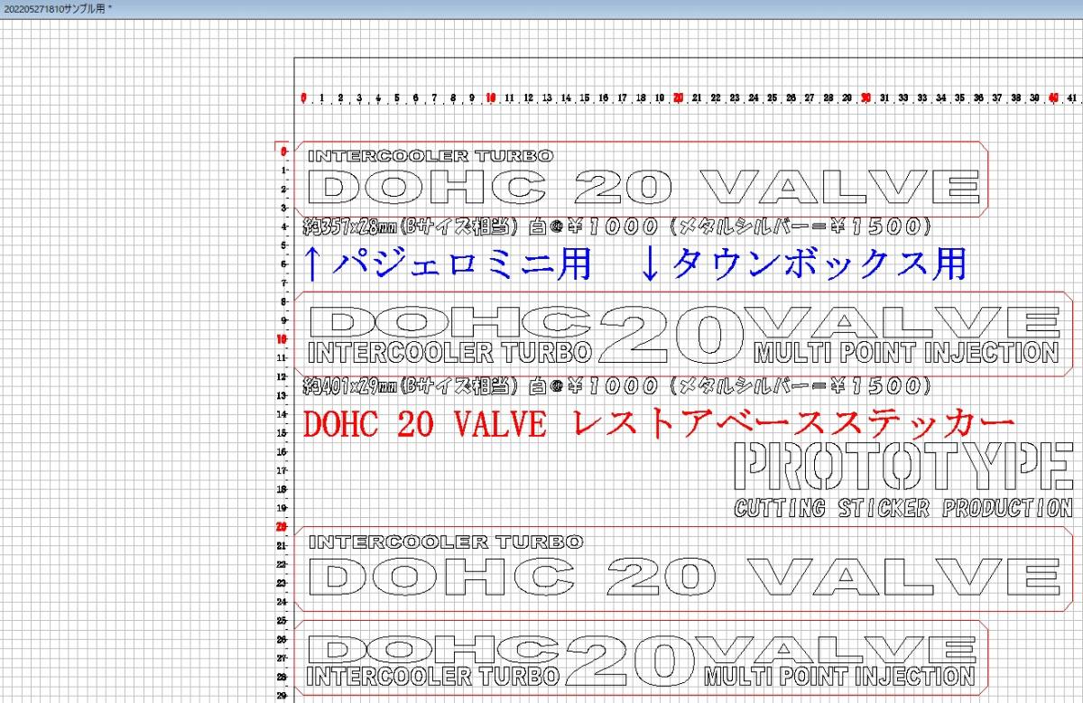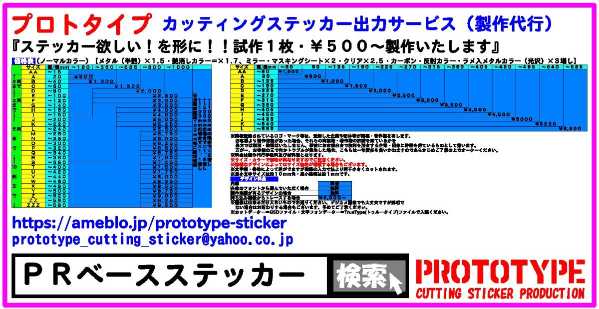 | ■出品文章長いです携帯電話では全文・画像リンク等が表示されない場合がございます 必ずヤフーにログインしたPCで最後までご覧になってご理解の上で入札ください。 ① ② ③ ④ ⑤新作・旧作・大きいサイズ・貼り付け例等はこちらをご覧ください。 ★その他:三菱自動系はこちら★ ★その他:画像一覧はこちら★ ■落札者様の代理で製作という形になります。 料金は代行手数料及び材料費となります。 製作代行となりますので画像はサンプルです。 ロゴだけが残るステッカーのオーダーメイド製作です 表面の転写シートは十分定着してから剥がしてください。 ■即決価格はノーマルカラー・汎用サイズ・1枚の価格です。 ※サイズ・カラー・数量によっては総額が異なりますのでご注意ください 指定のデザイン・サイズ・カラー・数量で製作いたします 落札後の取引ナビにてデザイン名・色・サイズをお申し付けください。 【見積もり・オーダー記入例】 商品名:パジェロミニ系ステッカー デザイン名:PAJERO MINI サイズ:①汎用サイズ(約150×約10mm) 色:メタルカラー・メタルシルバー 数量:1 商品名:パジェロミニ系ステッカー デザイン名:MONTERO MINI サイズ:②フロント エンジンフードロゴステッカー(約800×約30mm) 色:ノーマルカラー・グレー 数量:1 商品名:パジェロミニ系ステッカー デザイン名:MONTERO MINI サイズ:③リアサイズ ナンバー灯上部ロゴステッカー(約800×約30mm) 色:黒地+メタルシルバー文字 数量:1 商品名:パジェロミニ系ステッカー デザイン名:VR-Ⅱ サイズ:④ドアサイドサイズ(約215x約30mm) 色:ノーマルカラー・グレー 数量:1 商品名:パジェロミニ系ステッカー デザイン名:DOHC20VALVE INTERCOOLER TURBO サイズ:⑤リアサイド(約357×約28mm) 色:ノーマルカラー・グレー 数量:1 商品名:パジェロミニ系ステッカー デザイン名:SOHC16VALVE NATURAL ASPIRATION サイズ:⑤リアサイド(約357×約28mm) 色:ノーマルカラー・黒 数量:1 その他の出品物 との同時梱包も可能です。 ■商品名:パジェロミニ系ステッカー製作代行 デザイン名:①MONTERO MINI 汎用サイズ(約150×約10mm) ¥250(ノーマルカラー) ②PAJERO MINI フロントサイズ エンジンフードロゴステッカー(約800×約30mm) ¥1500(ノーマルカラー) ③PAJERO MINI リアサイズ ナンバー灯上部ロゴステッカー(約265×約26mm) ¥1000(ノーマルカラー) ④VR-Ⅱ ドアサイドサイズ(約215x約30mm)\1000(ノーマルカラー) ⑤DOHC20VALVE INTERCOOLER TURBO リアサイドサイズ(約357×約28mm)\1000(ノーマルカラー) MONTERO MINI=パジェロミニの輸出仕様をイメージしたロゴステッカーです。 リアは黒地にシルバー色の切り文字ステッカーが貼ってあるステッカーです。 PAJERO MINI ・その他の文面でも製作いたします、ご相談ください。 ◎レストアベースステッカ― DOHC20VALVE INTERCOOLER TURBO ステッカー パジェロミニ サイドデーカル ステッカー ¥1000(ノーマルカラー) (シルバー=\1500) ※サイズ・カラーで価格が異なりますのでご注意ください。 ※純正 DOHC インタークーラーターボ 20バルブ ステッカー 参考価格(現在絶版) ※シルバー・グレー 部品番号 MR221652 金額約\2500(片側) ※グレーメタリック 部品番号 MR221653 金額約\2500(片側) ※長側面1000mm以上のサイズは超過100mm毎に割増価格になります。 (+~100mmの場合で×1.1・+~500mmの場合で×1.5・+1000mmの場合で×2増し) ※文字の余白もサイズに含まれます ハートマーク付きはご希望の方には別途赤色の物を同封します。 その他のキャラVer・曲名・文面でも製作いたします、ご相談ください。 長いサイズに付きましては分割になる場合がございます、ご了承ください。 ※通常は不要な部分は剥がして表面に転写シートを貼りますが -・等細かい部位の周りを剥がす際に一緒に剥がれてしまうので 一部不要部残しますのでお手数ですが十分定着してから後から剥がしてください ■価格:ノーマルカラー(Aサイズ 1枚=¥500) Aサイズ 約 200×20mm 又は 約 90× 90mm @ 500 Bサイズ 約 400×40mm 又は 約 135×135mm @1000 Cサイズ 約 600×60mm 又は 約 180×180mm @1500 Dサイズ 約 800×80mm 又は 約 225×225mm @2000 Eサイズ 約1000×100mm 又は 約 270×270mm @2500 Lサイズ 約1000×240mm 又は 約 585×585mm @5500 ZZZサイズ約1000×580mm @9500 縮小AAサイズ @1000 メタルカラー(半艶)=×1.5 艶消しカラー=×1.7 ミラーカラー=×2 クリアカラー=×2.5 カーボンカラー・反射カラー・ ラメ入メタルカラー(光沢)・蛍光カラー=×3の割り増し価格になります。 ※サイズ・カラーで価格が異なりますのでご注意ください。 ■屋外耐候5~6年(メーカー表記)タイプカッティングシート使用 (カーボン=3~5年・ノーマル・メタル=3~4年・反射=3年・ミラー=2年・蛍光=1~2年) 屋外用途の看板等に使用されているシートですので 水に濡れても剥がれる事なくお使い頂けます。 常時色を追加しております 最新在庫・色見本 よりカラーご指定ください。 アイロンプリント転写シート(×5の割り増し価格・白以外は取り寄せ対応)・ 塗装用マスキングシート(×2の割り増し価格)での製作等もご相談ください。 ■製作可能サイズ 最大:短側面約580mm ZZZサ