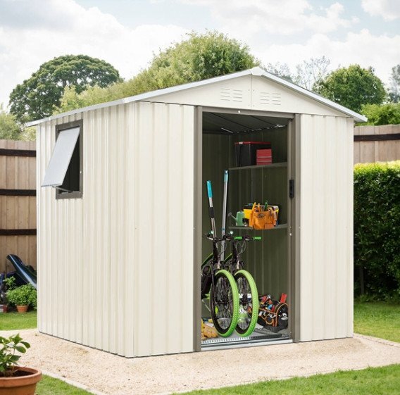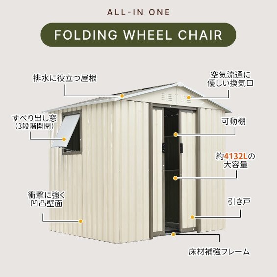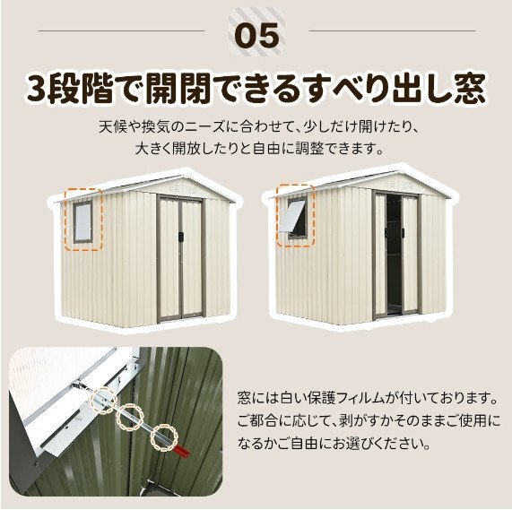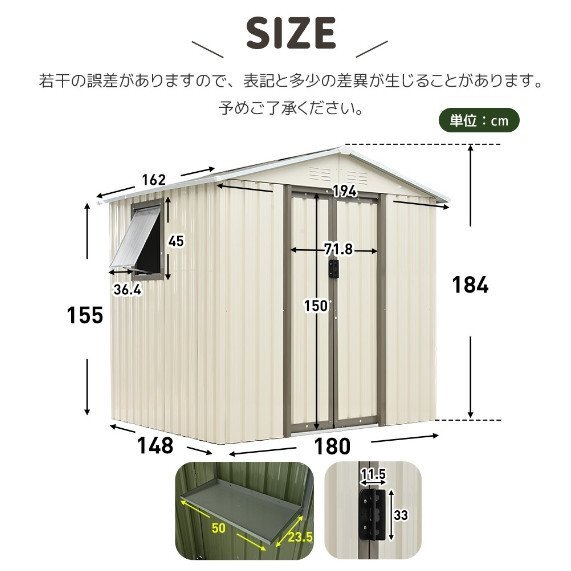 ◎01大容量でしっかり収納 約4132Lとたっぷり収納でき、ガーデニングの道具入れなど使い方は様々です。6×5FT 194*162*184cm約4132Lの大容量 ◎02スペースを有効活用できる可動棚 空間の利用自由度を最大限に高め、限られたスペースを無駄なく活用できます。棚板の耐荷重:2.5KG 上段の棚板は10cm間隔で調節可能です。 ◎03扉の開閉が邪魔にならない引き戸タイプ 開く時にドアを開けるスペースがいらないので、狭い場所でもスムーズにアクセスできます。単扉サイズ:150*36cm両扉サイズ:150*72cm ◎04取っ手で施錠可能 ドアの取っ手にはロックをかけるためのスペースが用意されています。ワイヤーロックなどを簡単に取り付けることができ、中のアイテムを安全に保管することができます。※ワイヤーロックは付属していません。 ◎04床材と屋根に補強加工の安心設計 スチール補強フレーム付きで、安全性・耐久性を向上させました!※床材は付属しておりません。ご自分でご用意をお願いしております。 ◎053段階で開閉できるすべり出し窓 天候や換気のニーズに合わせて、少しだけ開けたり、大きく開放したりと自由に調整できます。 設置場所を自由に選択窓の位置は左側・右側・後側から選べるため、設置環境に合わせたレイアウトが可能。 ◎06排水に役立つ人字形屋根 屋根には本体より大きめの人字形屋根を採用し、雨水が溜まらず、傾斜と排水溝を通じてスムーズに排水されます。これにより、内部への浸水を防ぎ、大切な収納物を安全に保護します。屋根の耐荷重:80KG ご注意:完全な防水仕様ではありませんので、事前に防水処理を行うことをお勧めします。 ◎07空気流通に優しい換気口 上部には前後に2つずつの換気口が付いており、ルーバーの形状で雨水も入りにくく、中の物も安心です。しっかりとした頑丈な素材 ハイテンション亜鉛メッキ鋼板採用有害物質が発生しない環境に配慮した粉体塗装仕上げで、衝撃に強くサビにくい特徴があります。外部には特別な防水加工が施され、製品全体が防水・防錆効果が優れています。 ◎08衝撃に強く凹凸壁面 壁面には特有の凹凸形状が採用されています。平滑な壁面と比較して、凹凸部分が外部からの衝撃や圧力を分散し、全体的により安定感が増しています。 ご注意:基礎工事を外部に依頼され、製品の不備などの問題が発生した場合でも、製品自体に対する保証しか承れません。予め二了承ください。 ※日本語の説明書を含む