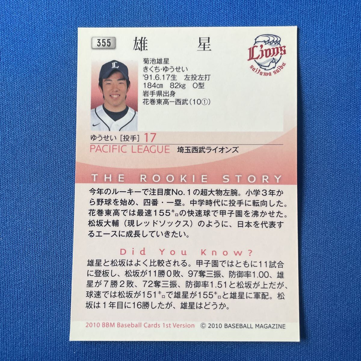 アクセスありがとうございます。 選手名:菊池雄星 メーカー:BBM 年度:2010年 No:355(ルーキーカード) お好きな方、ファンの方いかがでしょうか? 撮影の為スリーブを外しております。 ご了承下さい。 色々なカードを大放出致します。 ファンの方、お持ちで無い方、 この機会にいかがでしょうか? 【配送について】 シングルカードに関しましては、 何枚ご購入頂きましても、 配送費は、 ¥110(普通郵便/追跡番号無し) または ¥185(クリックポスト/追跡番号有り) どちらかをご選択下さい。 ※その他の配送方法をご希望の場合はご相談下さい。 (追加料金有り) ※複数枚ご購入頂いた場合、 配送方法を変更させて頂く場合がございます。 (追加料金は頂きません) ※必ずまとめて取引きの依頼をお願い致します。 依頼の無い場合は、単品取引きとさせて頂きます。 ※配送中の事故等の補償はございません。 【梱包】 スリーブ入れ、PP袋入れ、 折れない様に厚紙に挟みお送りします。 1.000円以上のシングルカードに関しましては、 基本トップローダーに入れてお送りさせて頂きます。 【お支払いについて】 必ずオークション終了後3日以内に、 ご住所等のご連絡をお願い致します。 ヤフー簡単決済のみとさせて頂きますので、 期限内(オークション終了後5日以内)にお手続きを必ずお済ませ下さい。 期限が過ぎましたら、 大変残念ですが、 落札者様都合でキャンセルさせて頂き、 ブラックリストに入れさせて頂きます。 【お願い】 最近落札されても何のご連絡が来ない方々が増えております。 他の購入希望者様のご迷惑となりますので、 くれぐれもご購入の意思のない方の入札はお辞め下さい。 他にも色々と出品しております。 宜しくお願い致します。 >